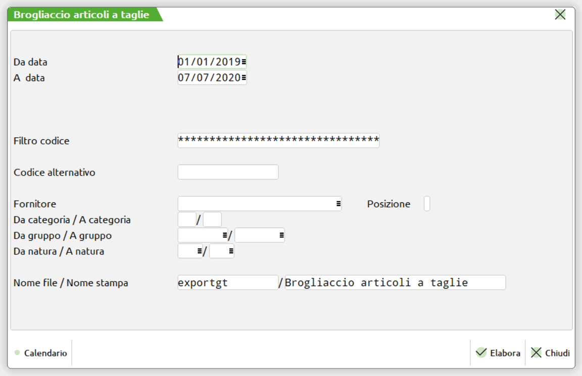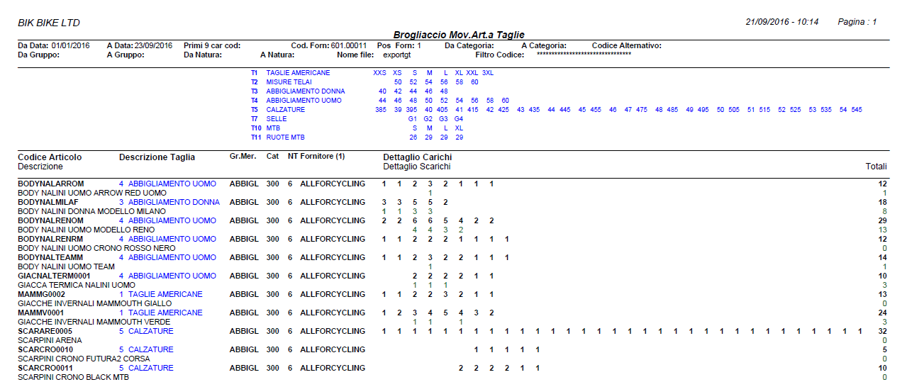 La stampa può essere impiegata per evidenziare i consumi e i carichi per Articoli a Taglia per Stagione. Grazie alla generazione di file in formato csv, l’Utente è in grado di realizzare confronti fra periodi e prodotti utilizzando strumenti come Office, OpenOffice, etc..