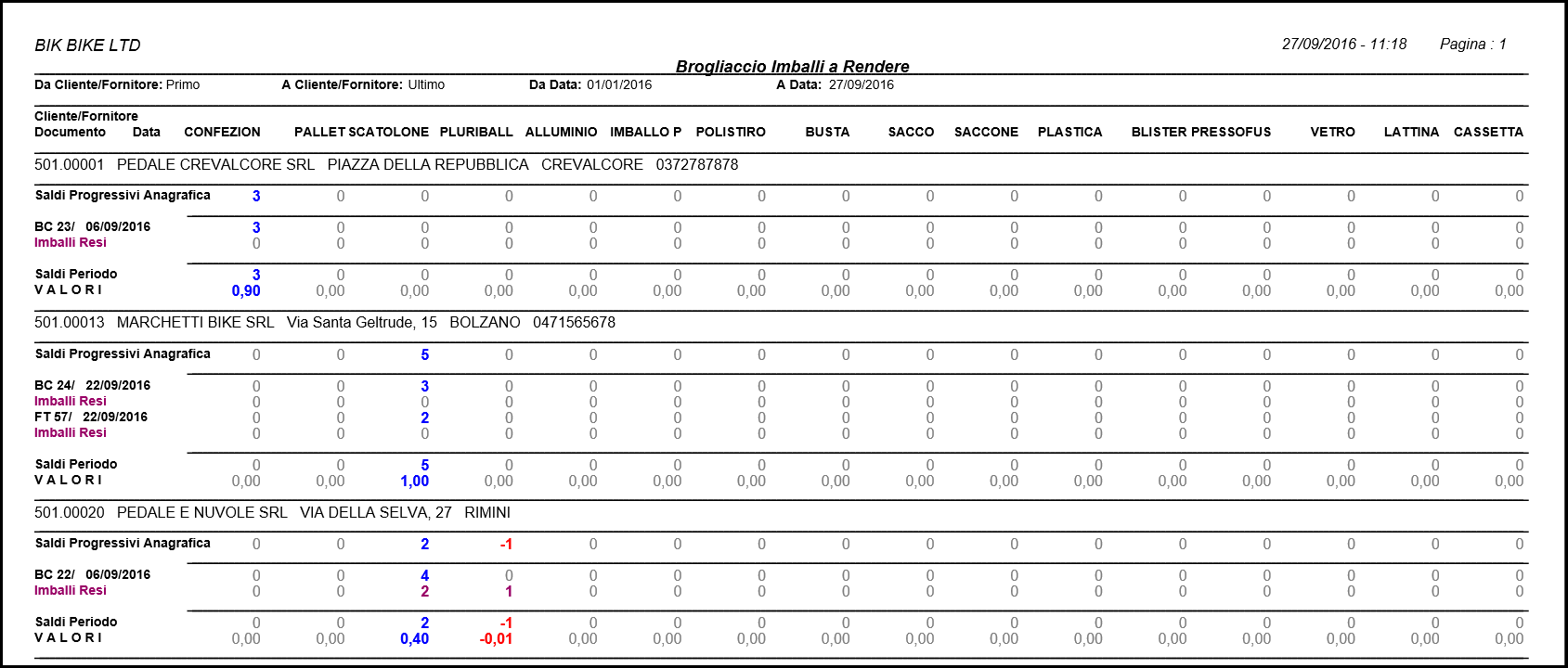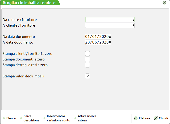 L’Applicazione esegue la stampa del brogliaccio degli Imballi a Rendere con periodi a cura dell'Utente anche infrannuali. Si possono selezionare sia Clienti che Fornitori. Opzionalmente si possono ottenere in stampa anche i dettagli a valore