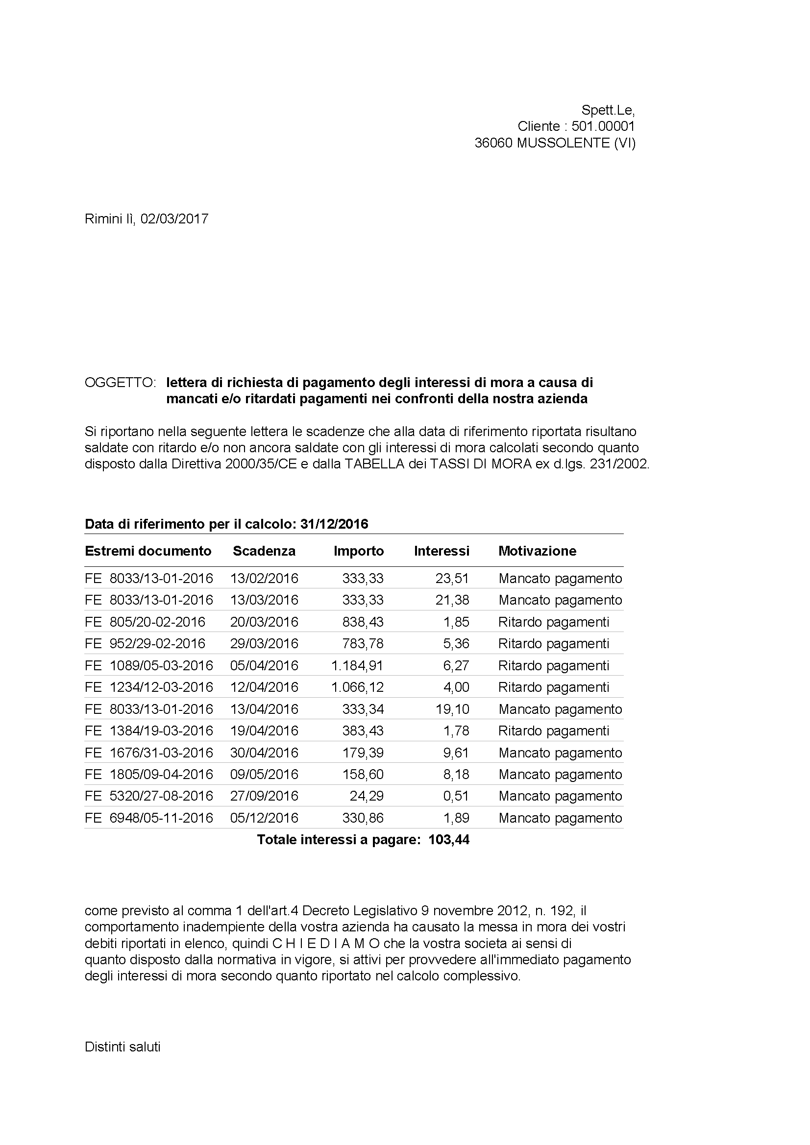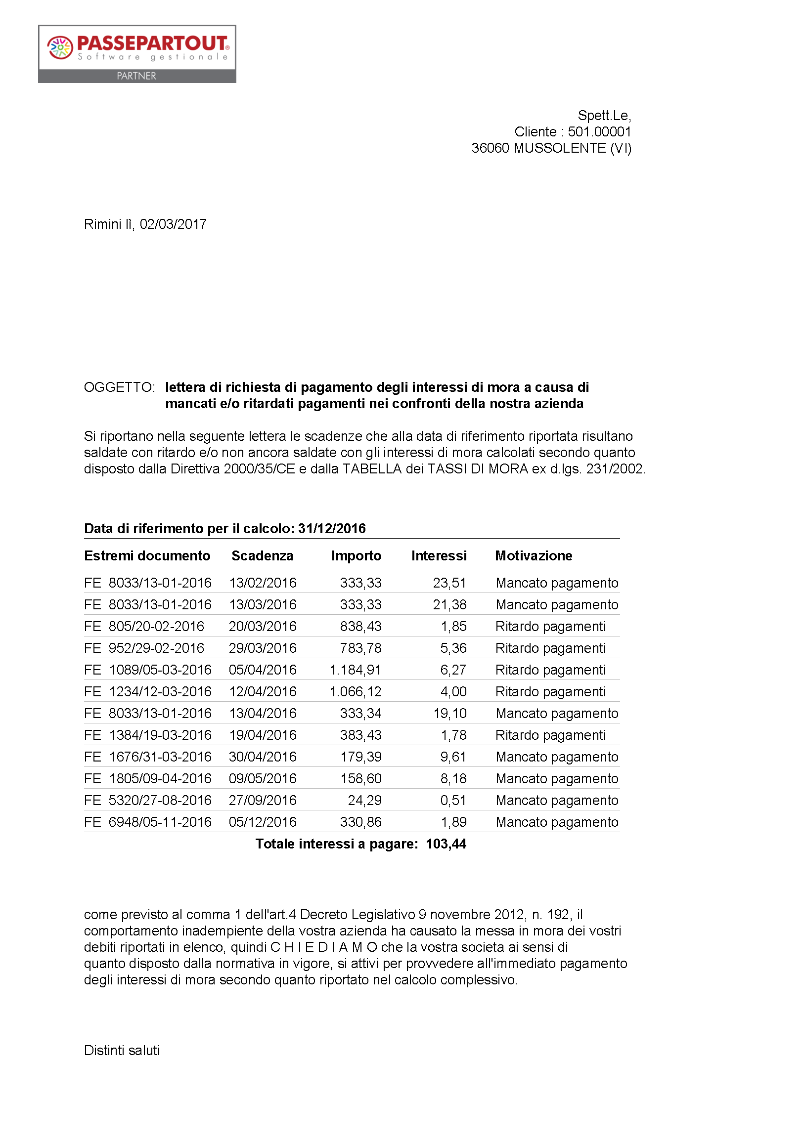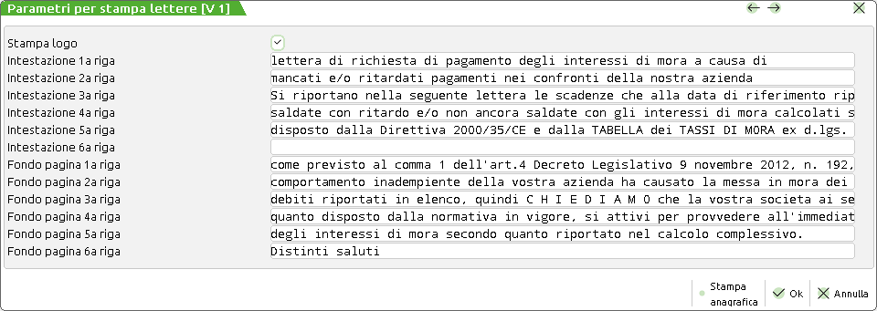 Successivamente al calcolo è possibile stampare l’elenco delle partite/scadenze e le lettere di richiesta di pagamento degli interessi di mora, secondo un modello di stampa configurabile dall’utente per la possibilità di stampare il logo aziendale e per la scelta delle 6 righe di testate e le 6 righe di piede pagina presenti nel modello.
