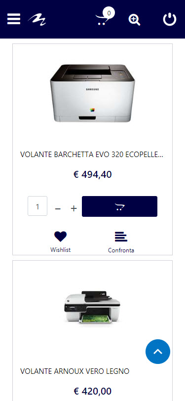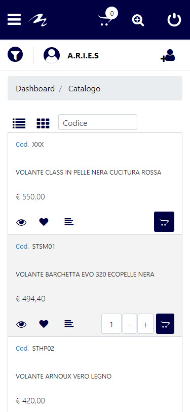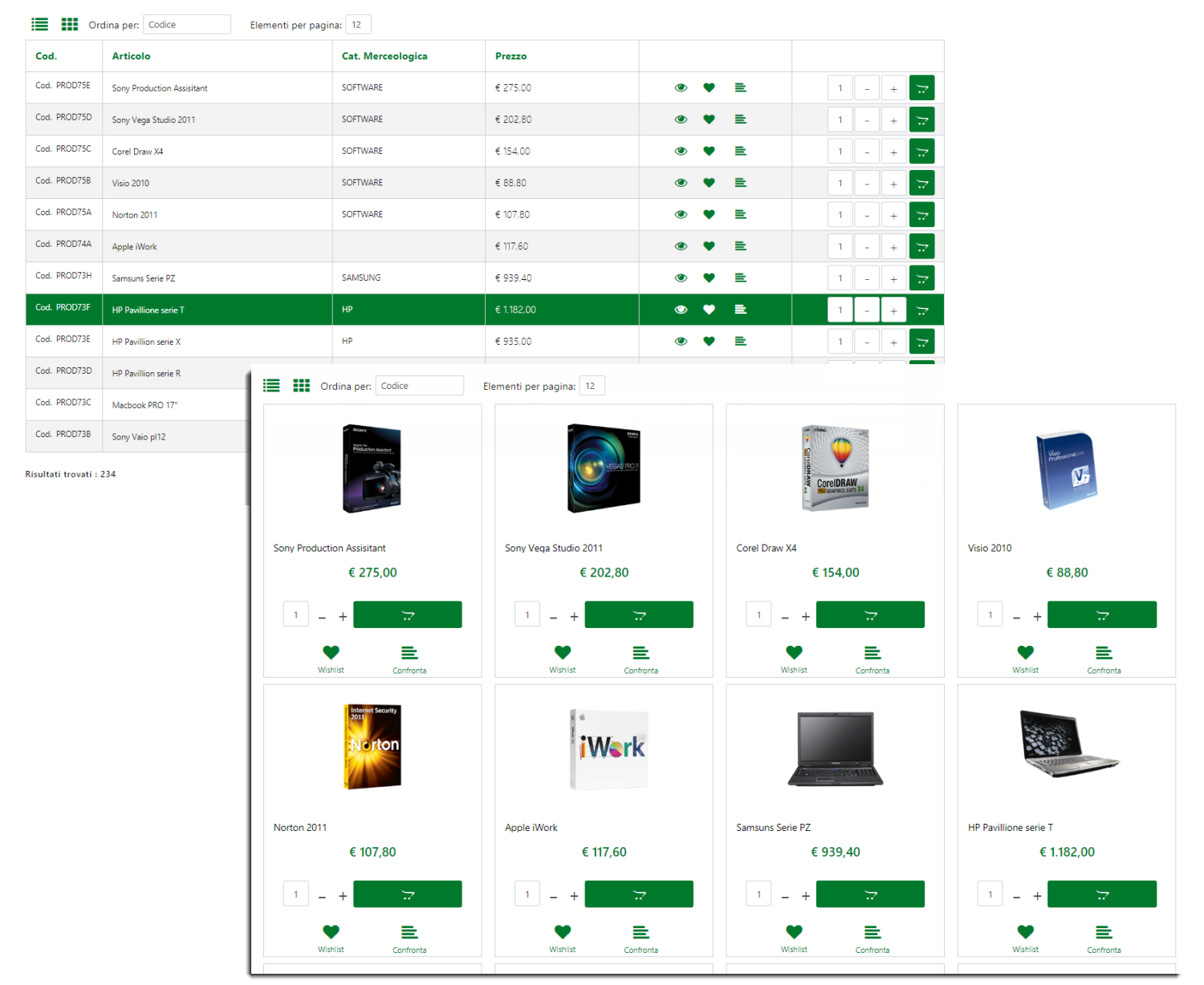 Catalogo Articoli con doppia visualizzazione: tabellare con quick view per dettaglio prodotto e personalizzata.