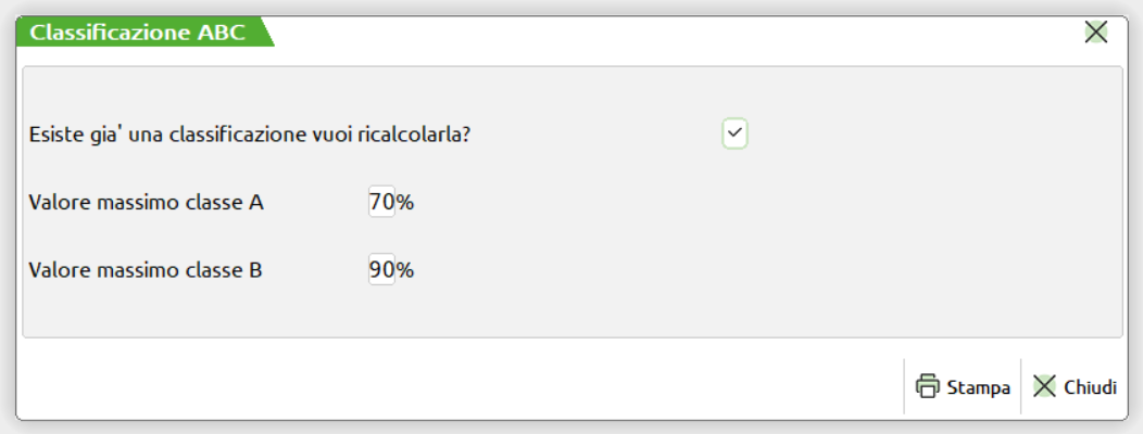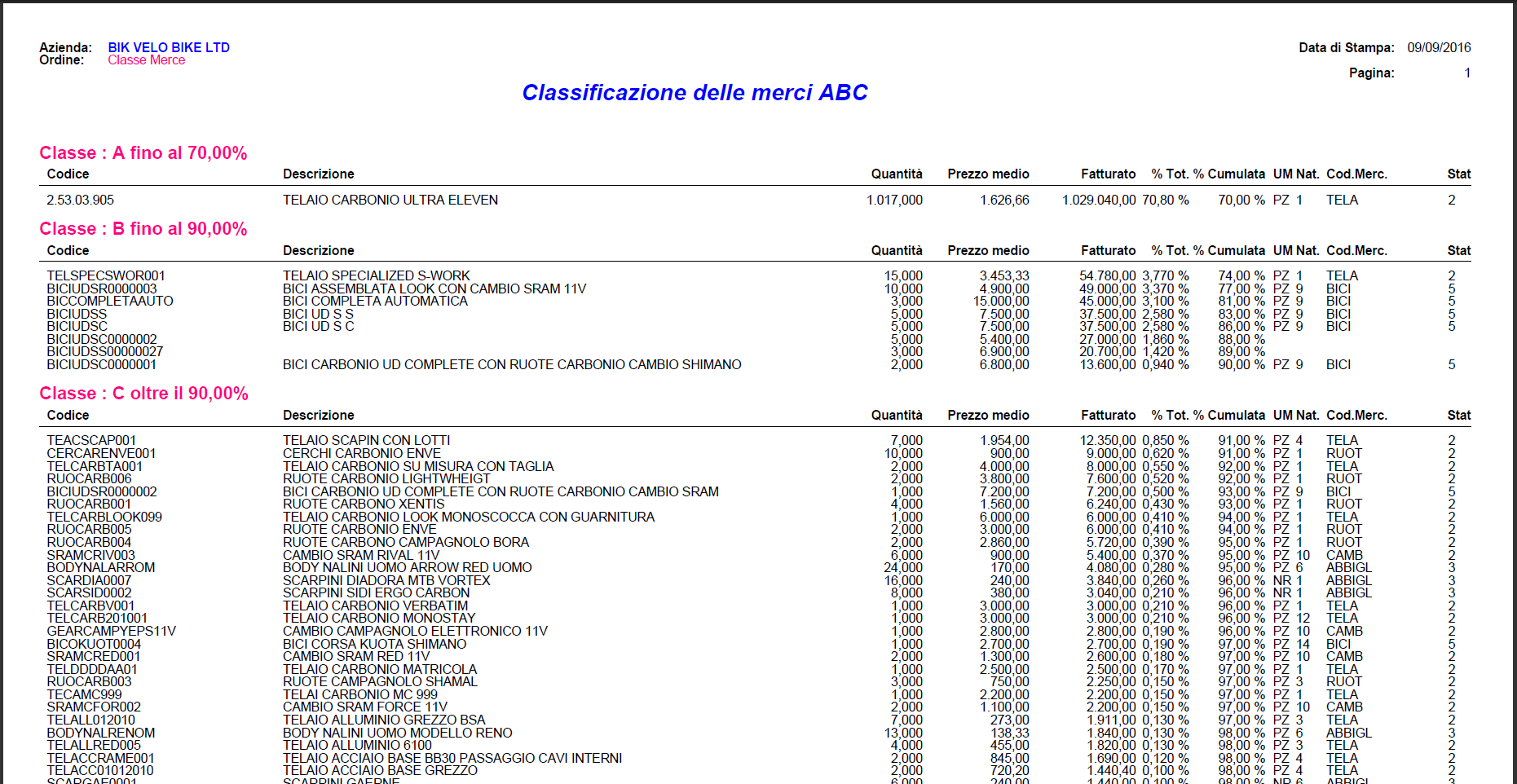 Report statistico utile a tutte le attività commerciali al fine di ottimizzare il controllo delle scorte di magazzino, concentrandosi sulle categorie merceologiche più rilevanti, ovvero, il peso delle classi ABC (legge di Pareto). L'applicazione esegue anche la partizione percentuale cumulativa.