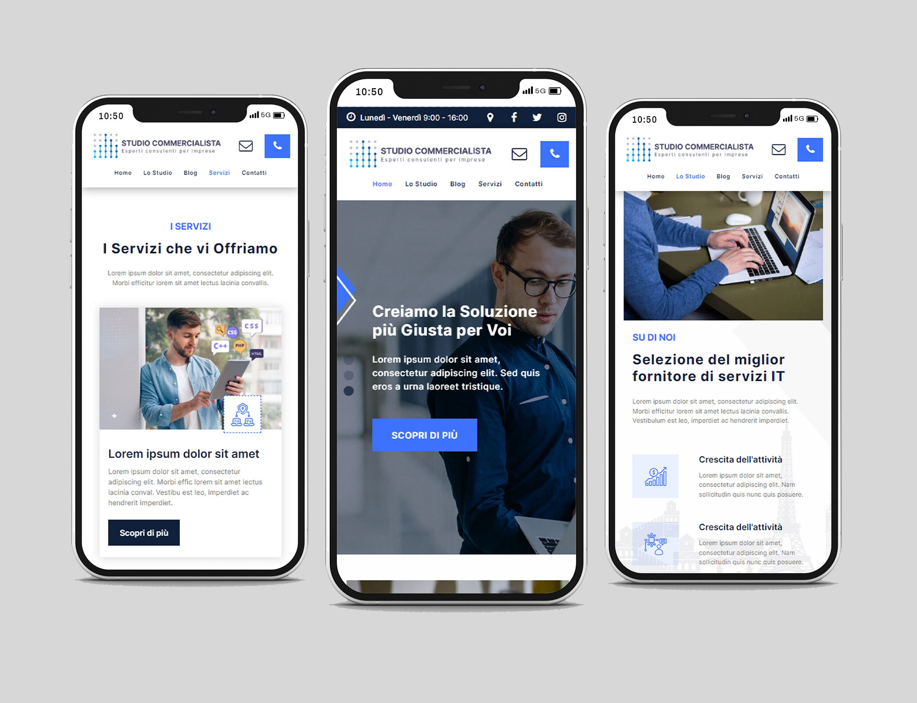 - Call to Action sempre in evidenza: telefono, email e modulo contatti facilmente accessibili per favorire il contatto tra utente e studio