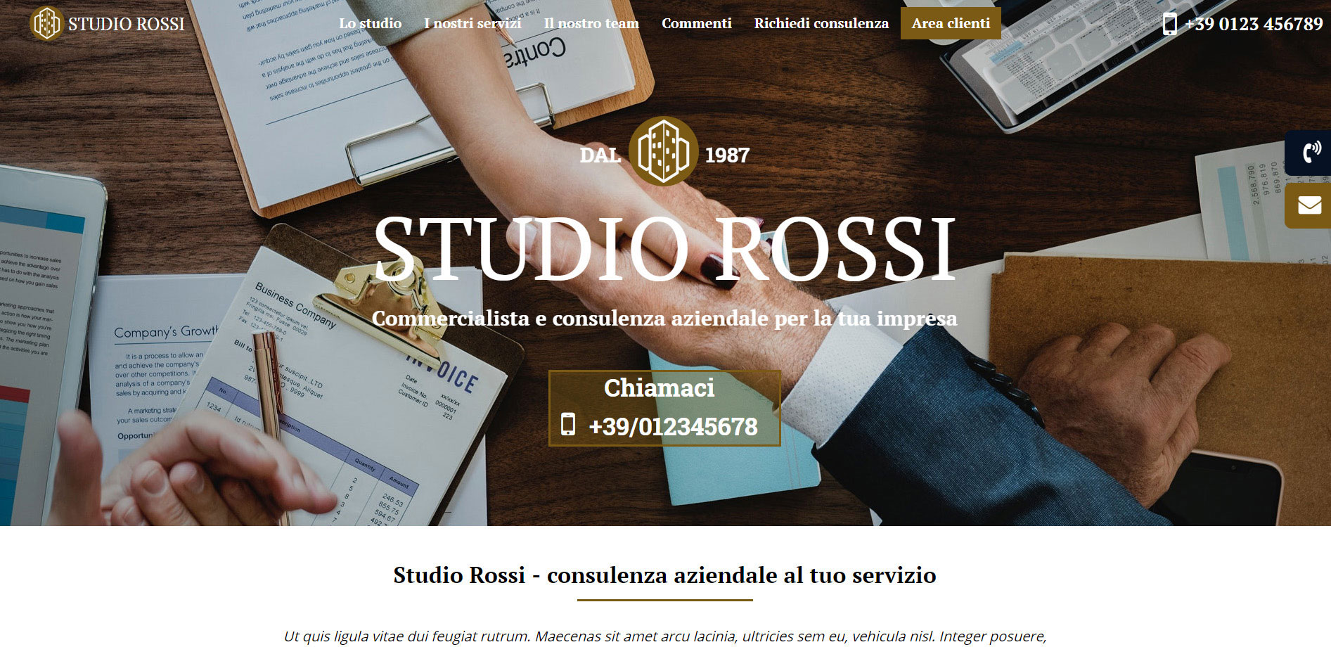 Template responsive a tutto schermo, ideale per gli studi commerciali e perfettamente integrato con il nostro software per commercialisti. Versione compatta strutturata su un'unica pagina.