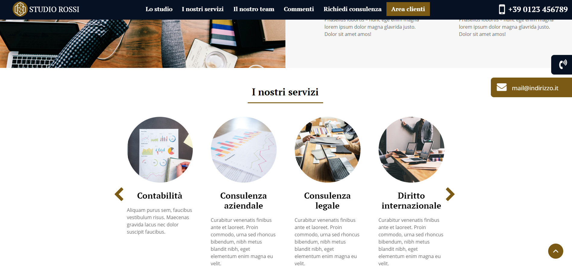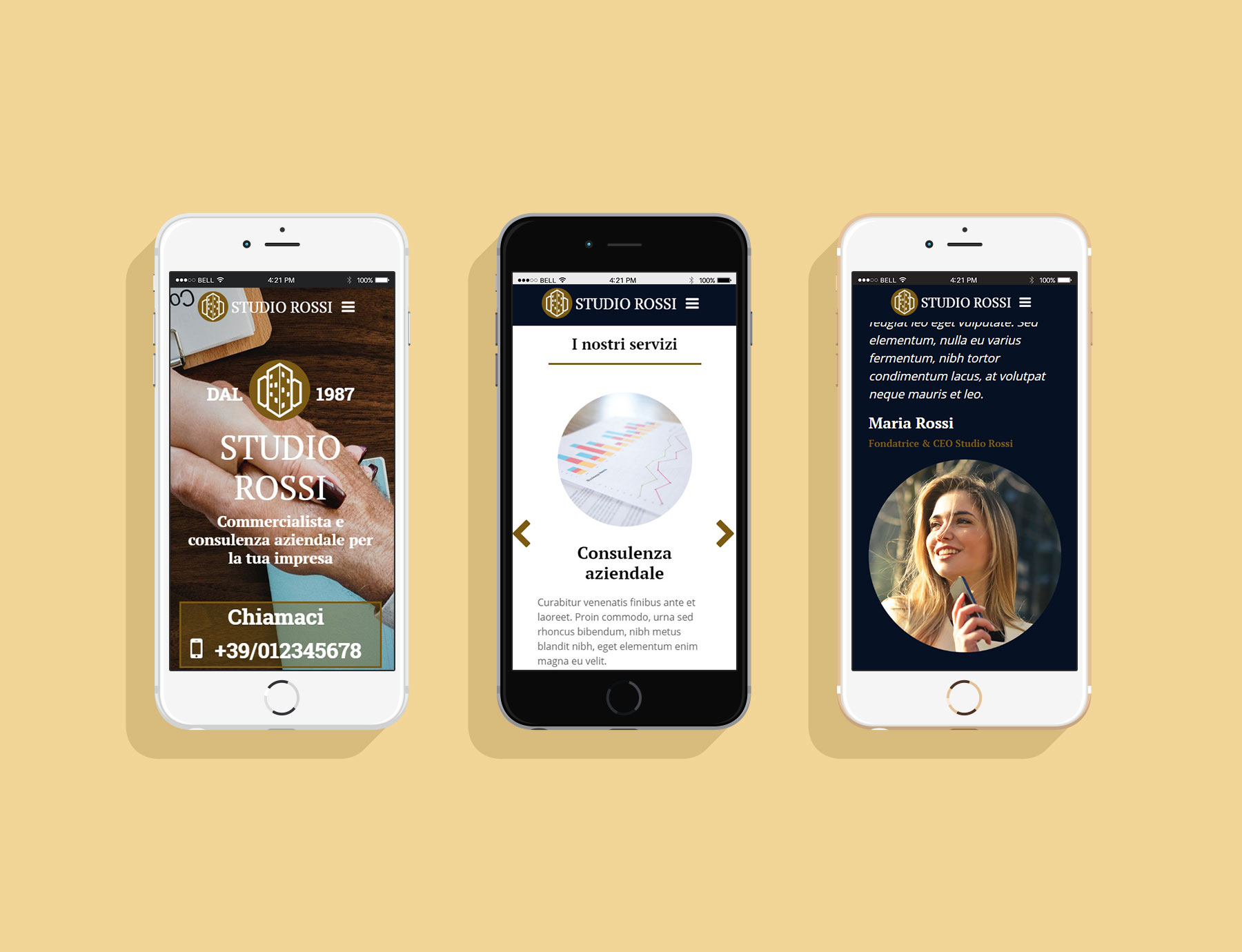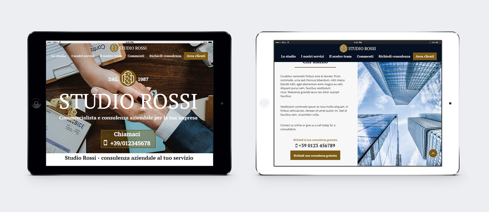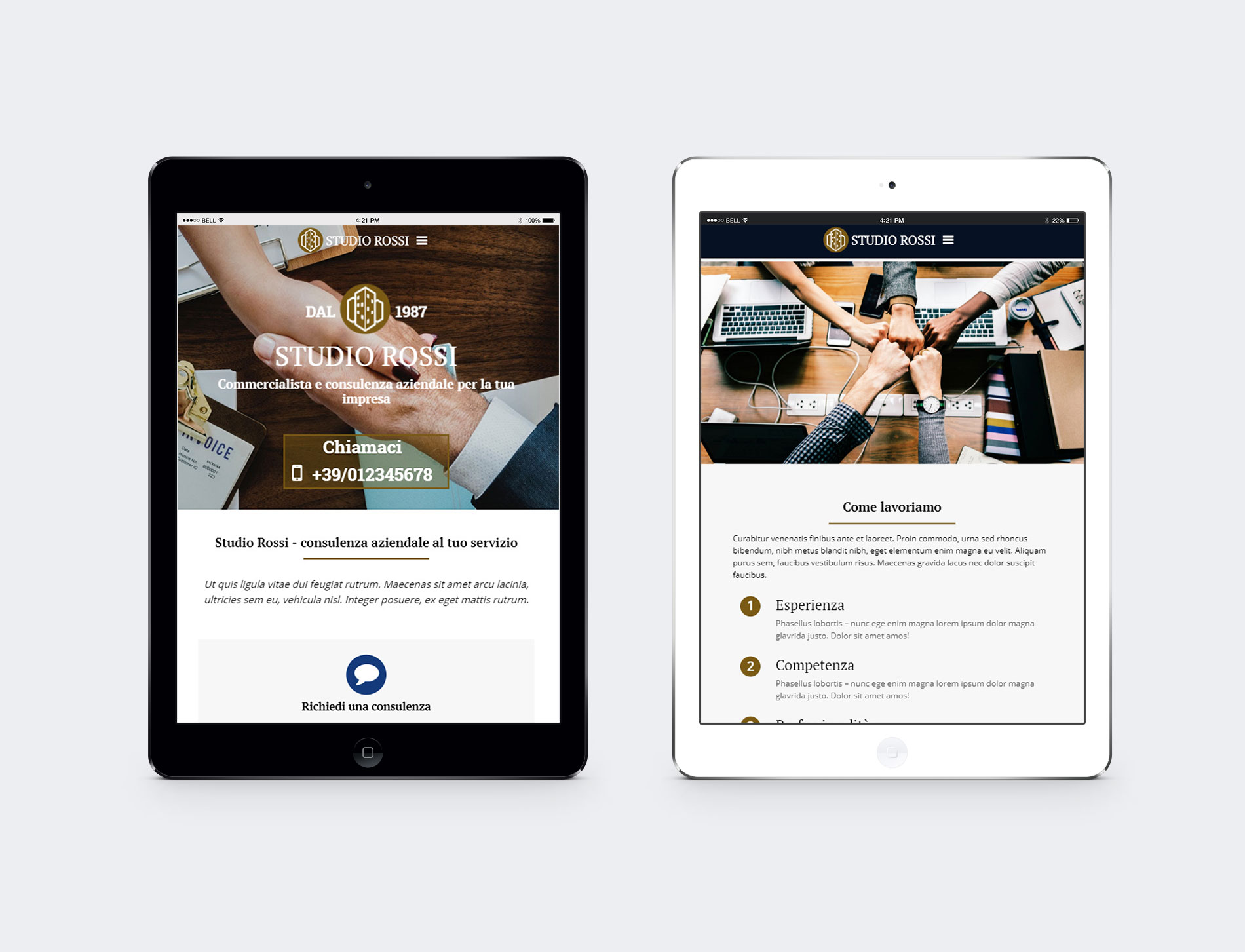 Design moderno e layout responsive come per la versione completa ma in versione one-page, ponendosi come vetrina efficace, semplice ed immediata per studi commercialisti, avvocati e notai.
