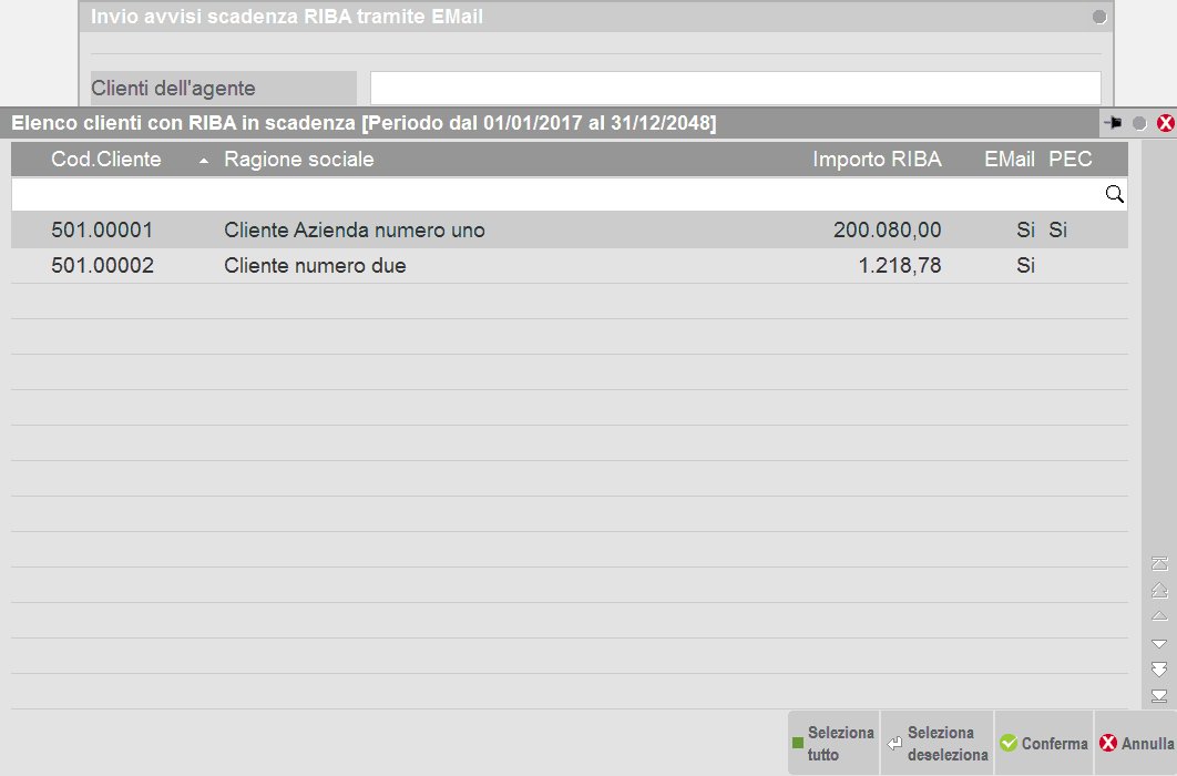 L’App permette di inviare una comunicazione tramite e-mail che ricorda al cliente le RIBA ed i Bonifici di prossima scadenza.