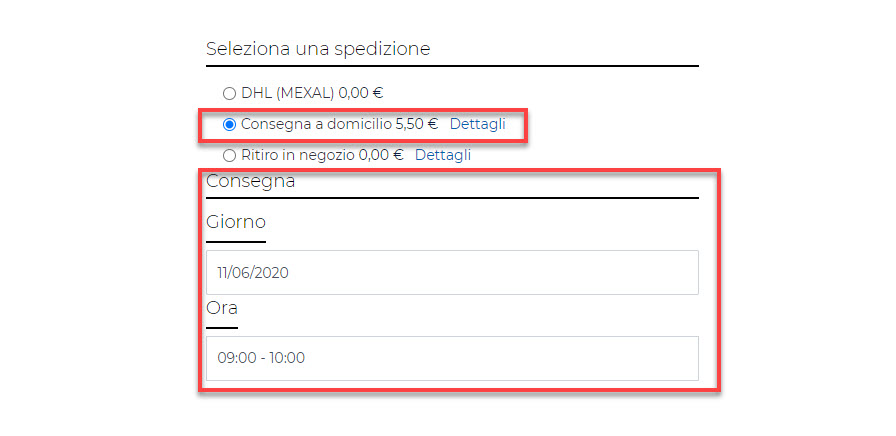 Indicazione, in fase di checkout della data e dell’orario di consegna della merce