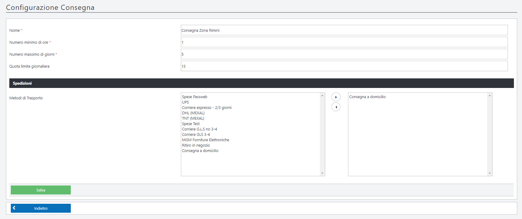 Definizione delle modalità di consegna a domicilio da associare alle spedizioni gestite sul sito