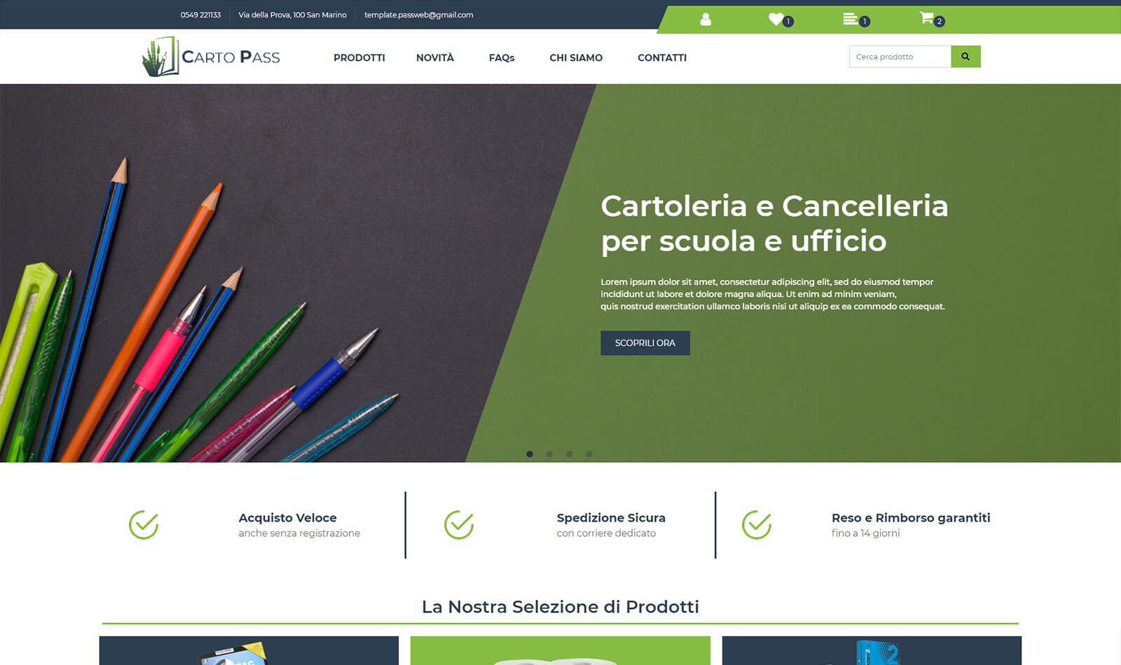 CartoPass o Cartoleria Shop è il modello perfetto per le cartolerie che vogliono entrare nel mondo del web con un sito moderno, minimale e funzionale.