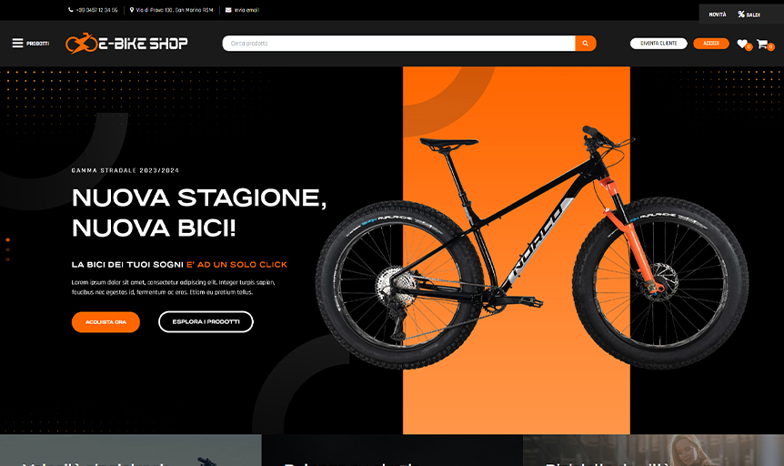 E-Bike shop è un template dal design accattivante e ricco di immagini ed effetti grafici, molto importanti per gli store dei settori articoli sportivi o fashion.