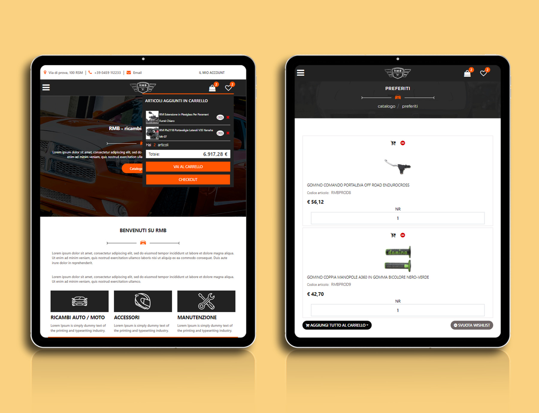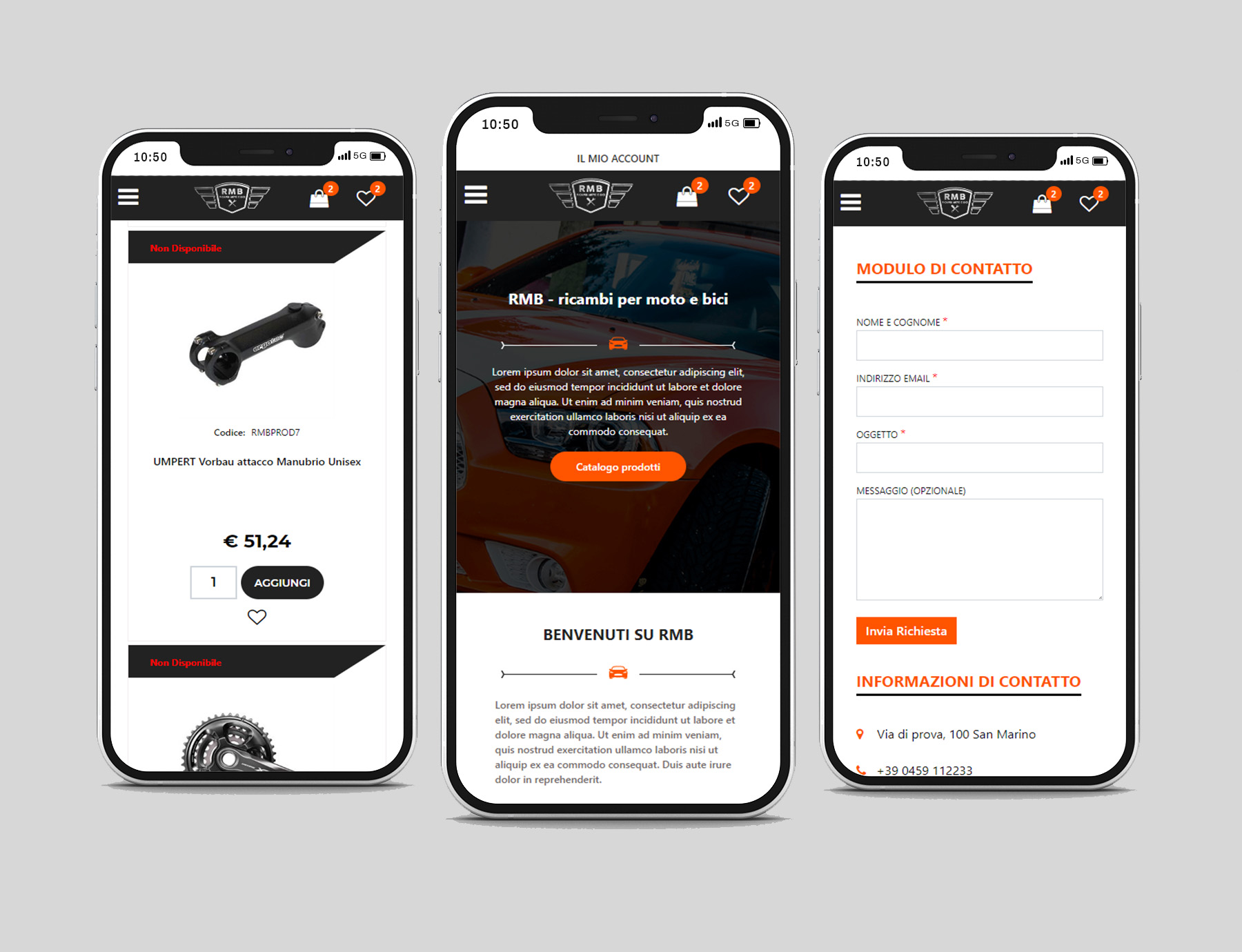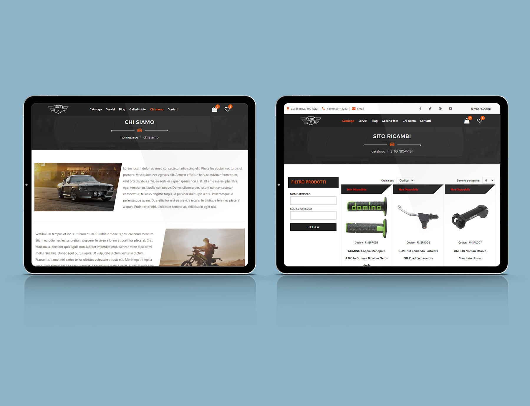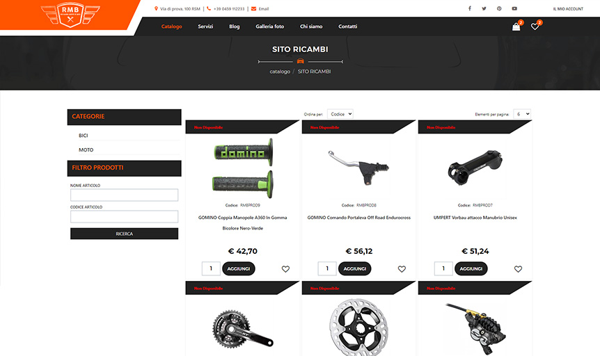 Studiato per adattarsi ad ogni tipologia di e-commerce, Ricambi Moto e Bici (RMB) gode di una grafica innovativa e dettagliata. Il carrello e la wishlist presentano una grafica semplice e moderna su desktop, più ottimizzata e compatta da mobile.