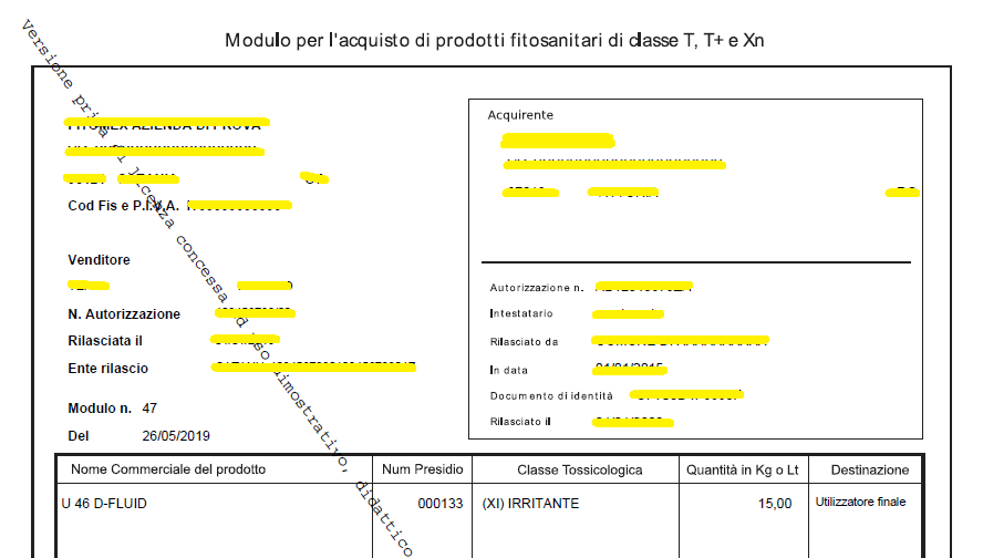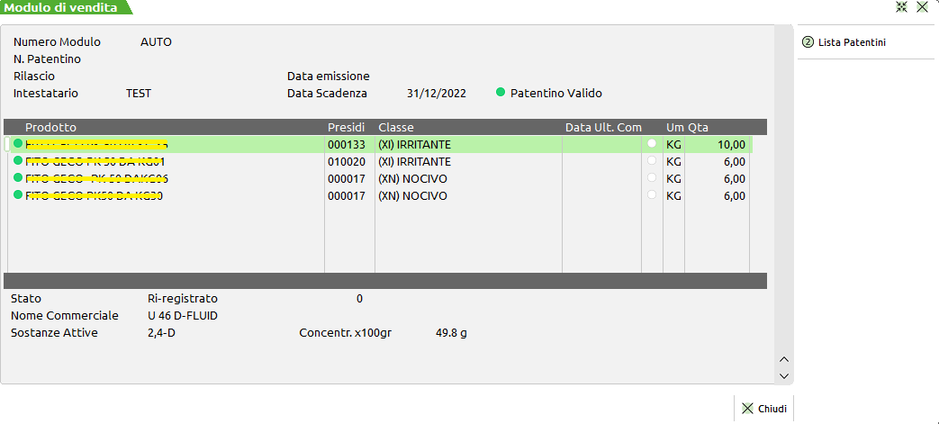 (v 1.6.2 ) Aggiunta gestione patentini venditori. Il modulo controlla se il venditore è abilitato alla vendita di prodotti fitofarmaci. Se il venditore non è abilitato il programma NON PERMETTE la vendita.