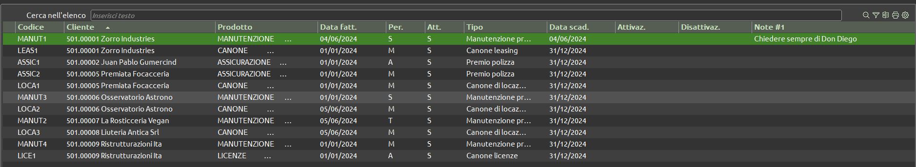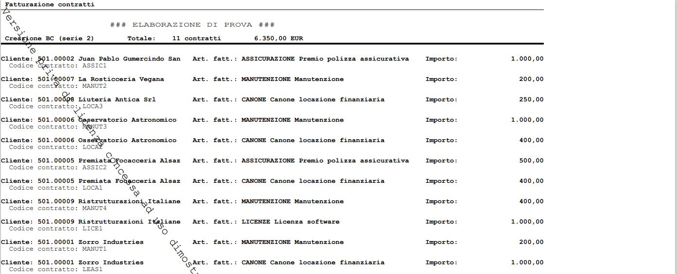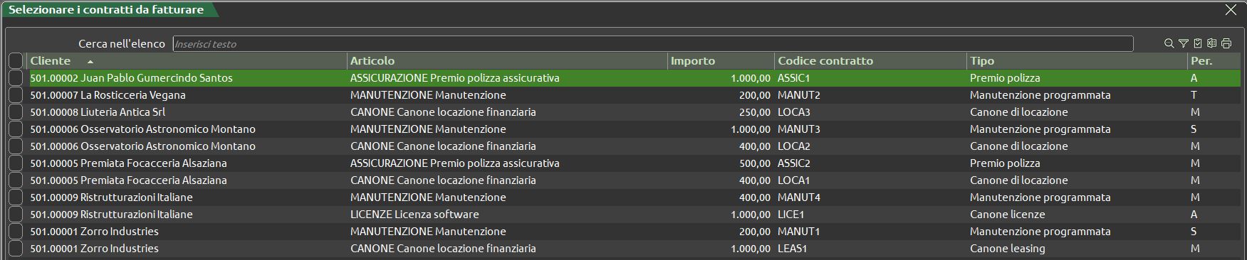 L’applicazione consente la gestione e fatturazione di contratti periodici, inseriti manualmente o tramite file .csv.