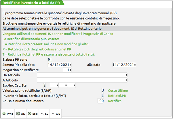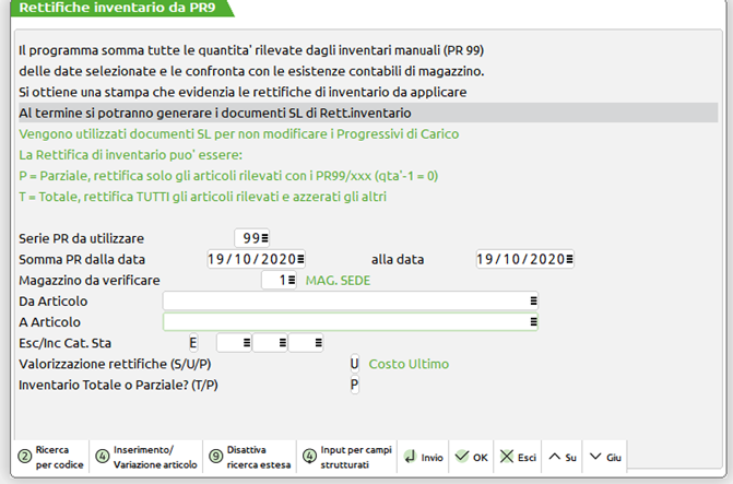 Il programma permette di gestire in modo snello e veloce le rettifiche inventariali per il magazzino fiscale, partendo da un documento di tipo “PR” e modificando le esistenze degli articoli per differenza.