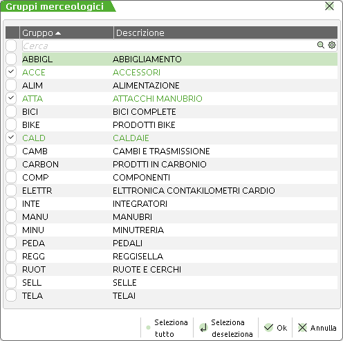 L'Utente può verificare fra i Clienti selezionati, coloro i quali hanno acquistato merci specifiche, indicando filtri per gruppo merceologico e natura, ed analizzando le vendute effettuate a partire da una certa data.