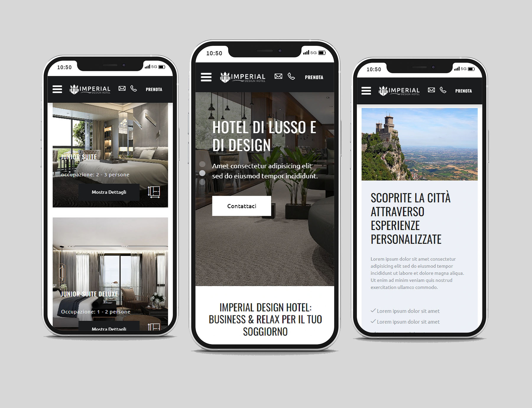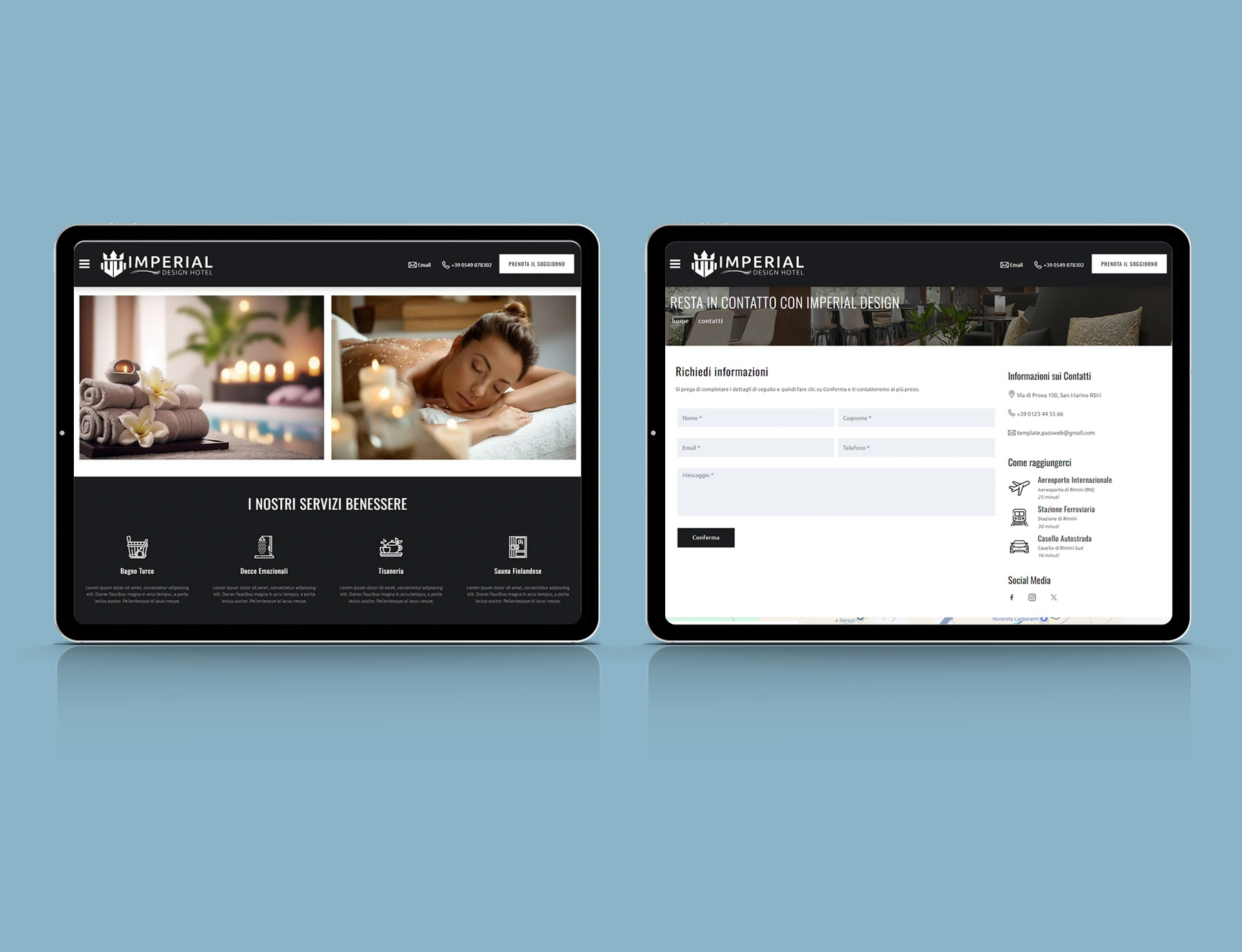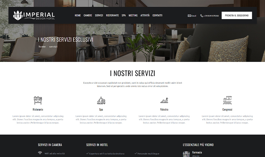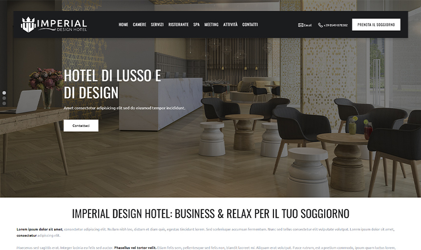 Imperial Hotel Design è un modello Passweb personalizzabile e funzionale per gli hotel. Ha una grafica responsiva che permette un'ottima visualizzazione del sito su ogni dispositivo, pagine personalizzabili e booking engine condiviso in ogni pagina.