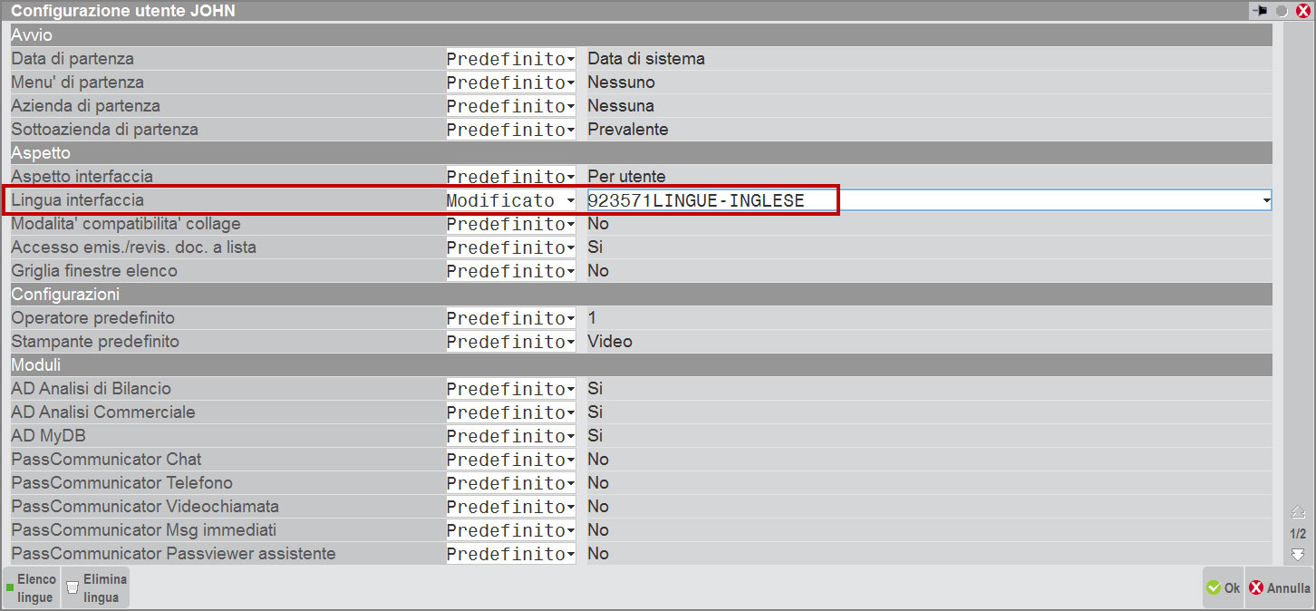 Gli utenti per cui è stata impostata la lingua inglese come lingua di interfaccia accedendo alle varie funzioni del programma visualizzeranno voci di menu, etichette, videate, messaggi tradotti in lingua inglese.