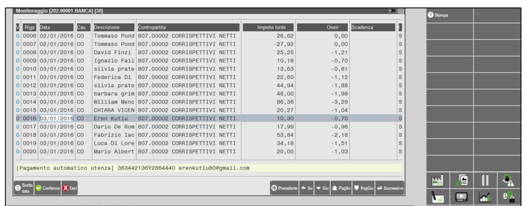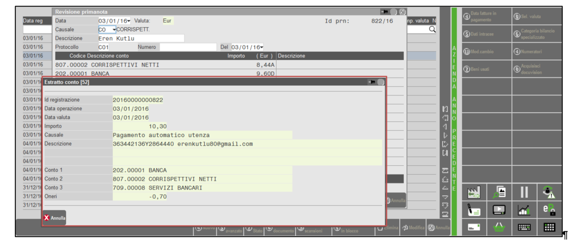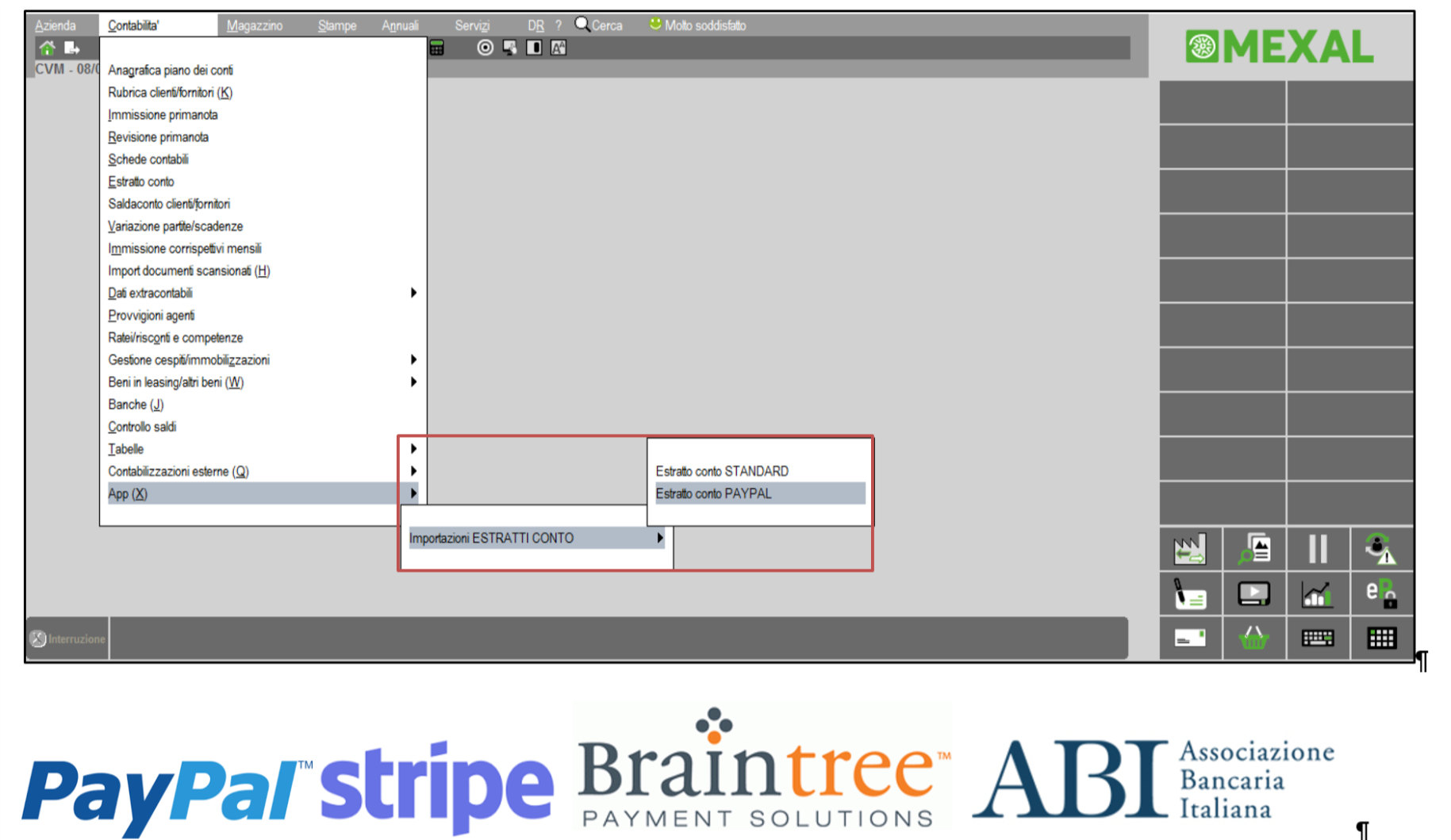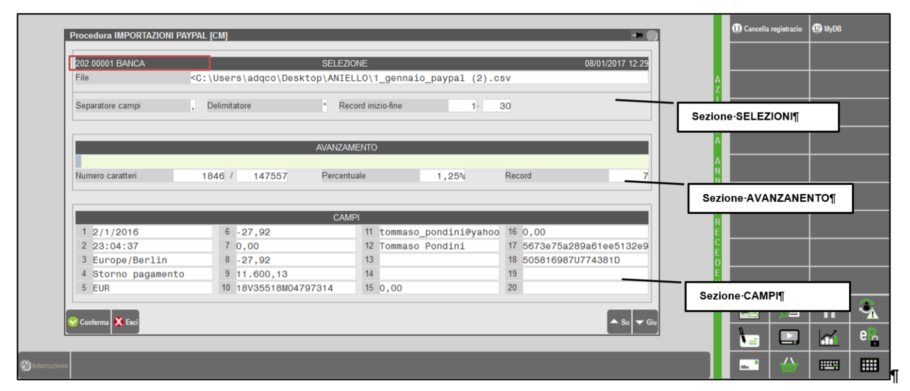 [Aggiornamento 3.4.0] - Aggiunta gestione data con MESE scritto per esteso - Aggiunta gestione importo con doppio separatore in punti (sia per i decimali che per le migliaia) - Aggiunta gestione frazionamento con 4 elementi - Aggiunta gestione estratto conto Amazon Migliore gestione del campo DATA PAGAMENTO: ove sia assente, viene forzato il valore della DATA REGISTRAZIONE [Aggiornamento 1.1.2] Importazione flusso INSOLUTI con individuazione del campo CONTROPARTITA e NUMERO DOCUMENTO [Aggiornamento 1.1.3] Aggiunto parametro PAGAMENTO per forzare la data di scadenza degli insoluti [Aggiornamento 1.1.4] - Corretto bug nella copia dei parametri tra aziende [Aggiornamento 1.1.5] - Corretto bug ricerca clienti o fornitori - Migliorata leggibilità griglia contropartita [Aggiornamento 1.1.6] Implementata gestione "VERSIONE DIMOSTRATIVA" con contestuale aumento periodo di prova [Aggiornamento 1.1.8] Corretto bug estrapolazione Anagrafiche clienti/fornitori e gestione livelli [Aggiornamento 2.0.0] Abilitazione mouse su tutti i campi di editazione Gestione SEGNO ALGEBRICO operazione estratto conto [formato estratto conto BANCA POPOLARE EMILIA ROMAGNA] Gestione CAUSALE PARZIALE [formato estratto conto BANCA DI CREDITO COOPERATIVO] Duplicazione CAUSALI Duplicazione TABELLA DI CORRELAZIONE Gestione SEPARATORE DECIMALI Gestione DIVISORE DECIMALI [Aggiornamento 2.0.1] Ottimizzata gestione allert monitoaggio [Aggiornamento 2.0.2] Migliorata gestione contropartite importazione paypal [Aggiornamento 2.0.3] Corretto bug importo con separatore decimali [.] [Aggiornamento 2.0.4] Corretto bug gestione piano dei conti a 2 livelli [Aggiornamento 2.0.5] Migliorata tabella di correlazione per piano dei conti a 2 livelli [Aggiornamento 2.0.6] Ulteriore miglioria gestione piano dei conti a 2 livelli [Aggiornamento 2.1.0] - Migliorato algoritmo estrapolazione scadenze; - Aggiunta stampa dati aggiuntivi mydb [Aggiornamento 2.2.0] - Aggiunto variabile DEFAULT CENTRO DI COSTO/RICAVO - Corretto bug TABELLA CORRELAZIONE E/C per piano dei conti a due livelli. [Aggiornamento 2.3.0] - Aggiunto parametro selezione CENTRO DI COSTO/RICAVO - Aggiunta tabella di correlazione SEGNO ALGEBRICO IMPORTO [Aggiornamento 2.4.0] Aggiunta gestione TABULATORE come separatore campi [Aggiornamento 2.5.0] Aumento velocità lettura file: previo apposito parametro viene diminuita l'interattività e migliorata la velocità di importazione: Aggiunta gestione CENTRO DI COSTO/RICAVO nella fase di monitoraggio. [Aggiornamento 2.5.2] Corretto bug selezione scadenze [Aggiornamento 2.6.0] Aggiunta nuova modalità di importazione "ottimizzata" per aumentare la velocità di importazione [Aggiornamento 2.7.0] Implementata nuova grafica navigazione campi Aggiunta nuova gestione scadenzari [Aggiornamento 3.0.0] Aggiunta nuova funzionalità ESTRAPOLAZIONE, per ricercare una chiave nella descrizione, a prescindere dalla posizione della stessa [Aggiornamento 3.0.1] Correzione bug minori [Aggiornamento 3.0.2] Ricompilazione [Aggiornamento 3.1.0] Aggiunta gestione NOTE REGISTRAZIONE e ONERI AGGIUNTIVI variabili [Aggiornamento 3.2.0] Aggiunta gestione DESCRIZIONE su più colonne