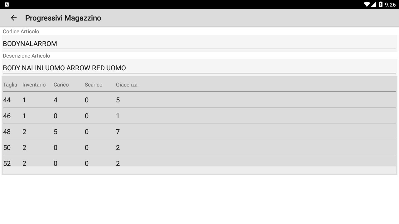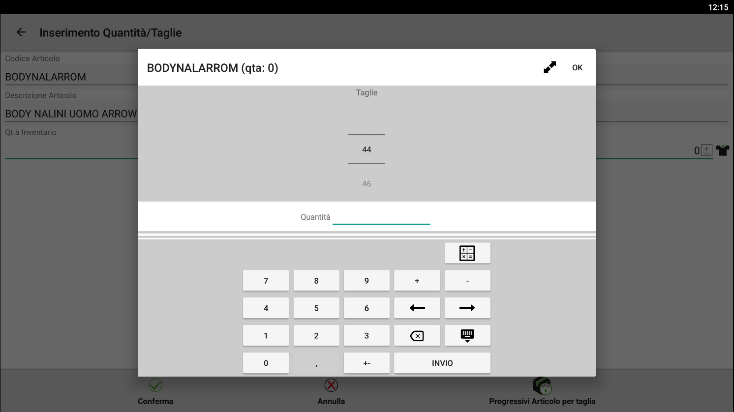 Una volta scelto l’articolo l'Utente può indicare la quantità in base all’unità di misura primaria. È previsto anche il caricamento delle taglie se l’articolo lo prevede.