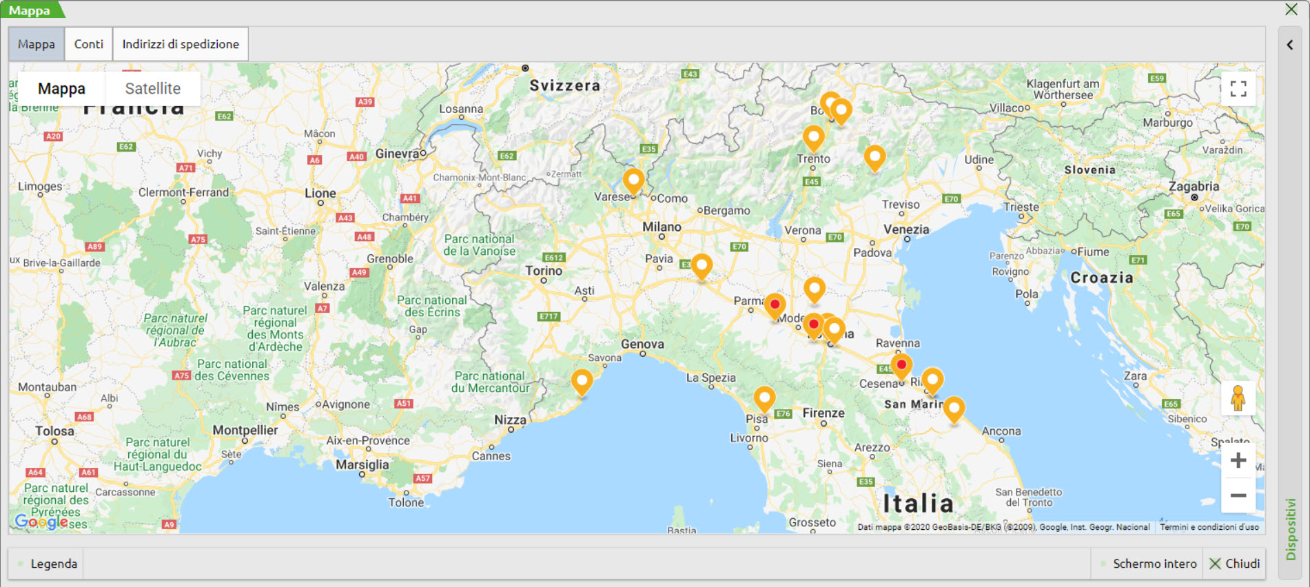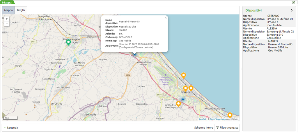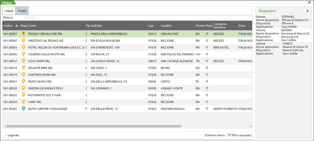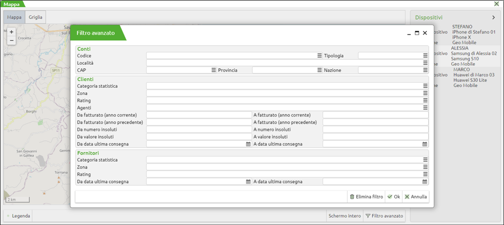 Sulla mappa, assieme agli utenti, si possono visualizzare anche clienti e fornitori tramite una potente gestione di filtri avanzati.