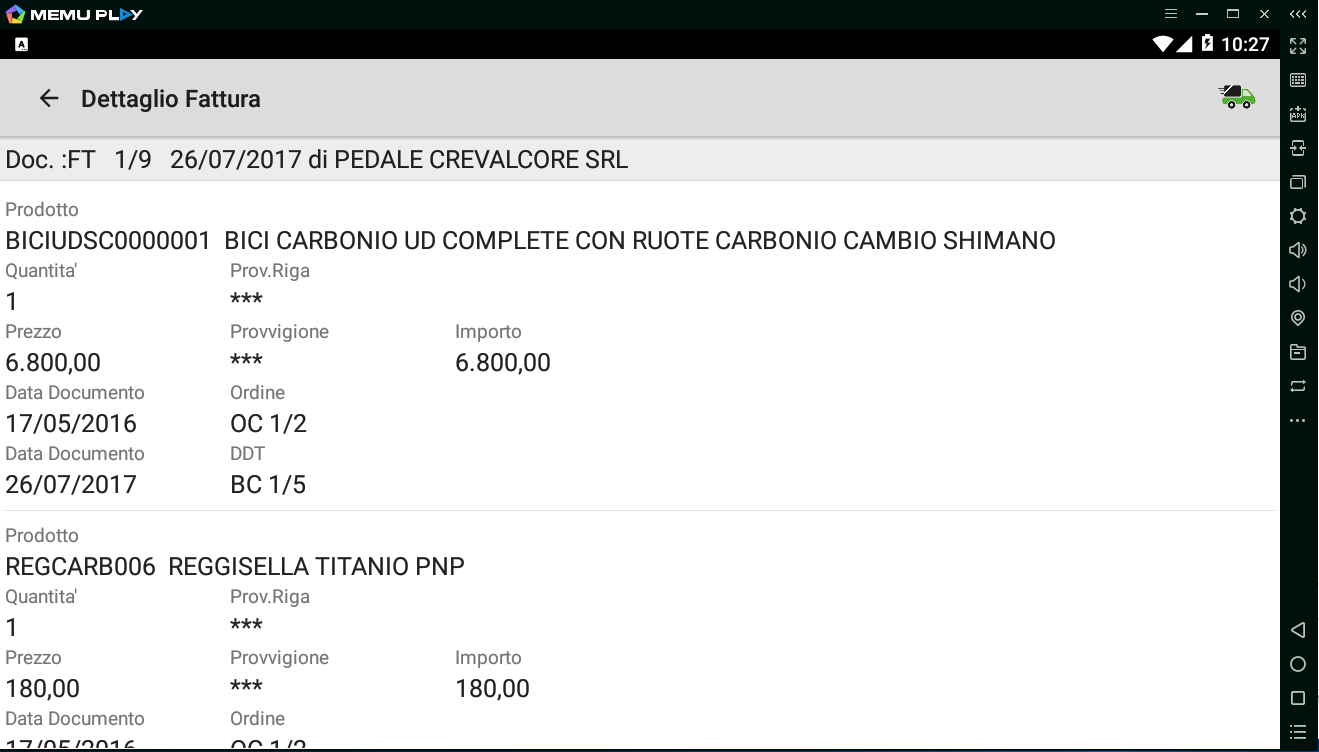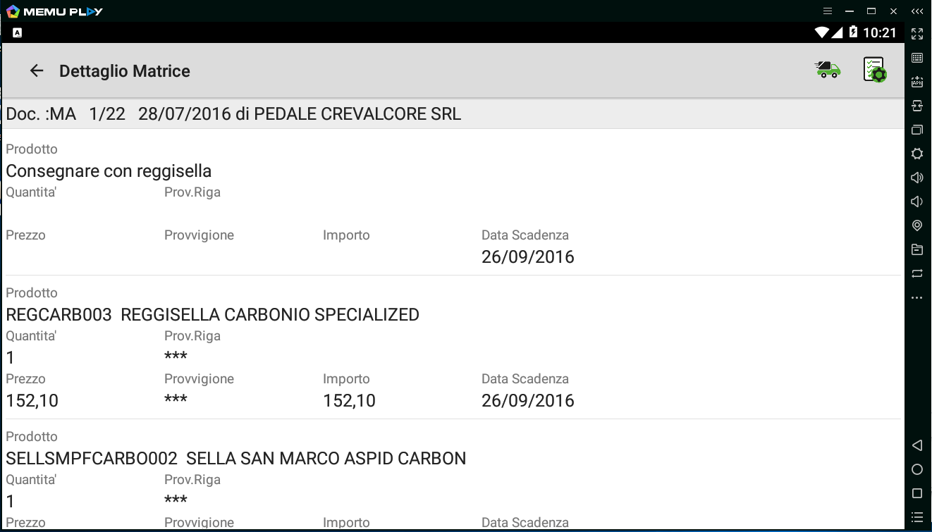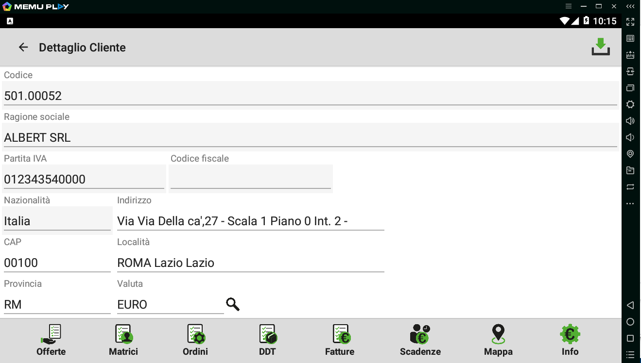 L’APP consente di accedere a tutte le informazioni dei Clienti assegnati all’Agente, sia su Tablet, sia su Smartphone: Dati anagrafici, Preventivi (Offerte), Matrici, Ordini, DDT, Fatture (con il riferimento agli Ordini ed ai DDT di provenienza). inoltre in modalità On-Line: Fido, Esposizione, Rating, Provvigioni maturate, Scadenze e Insoluti (sia con Gestione Partite, sia con Scadenzario).