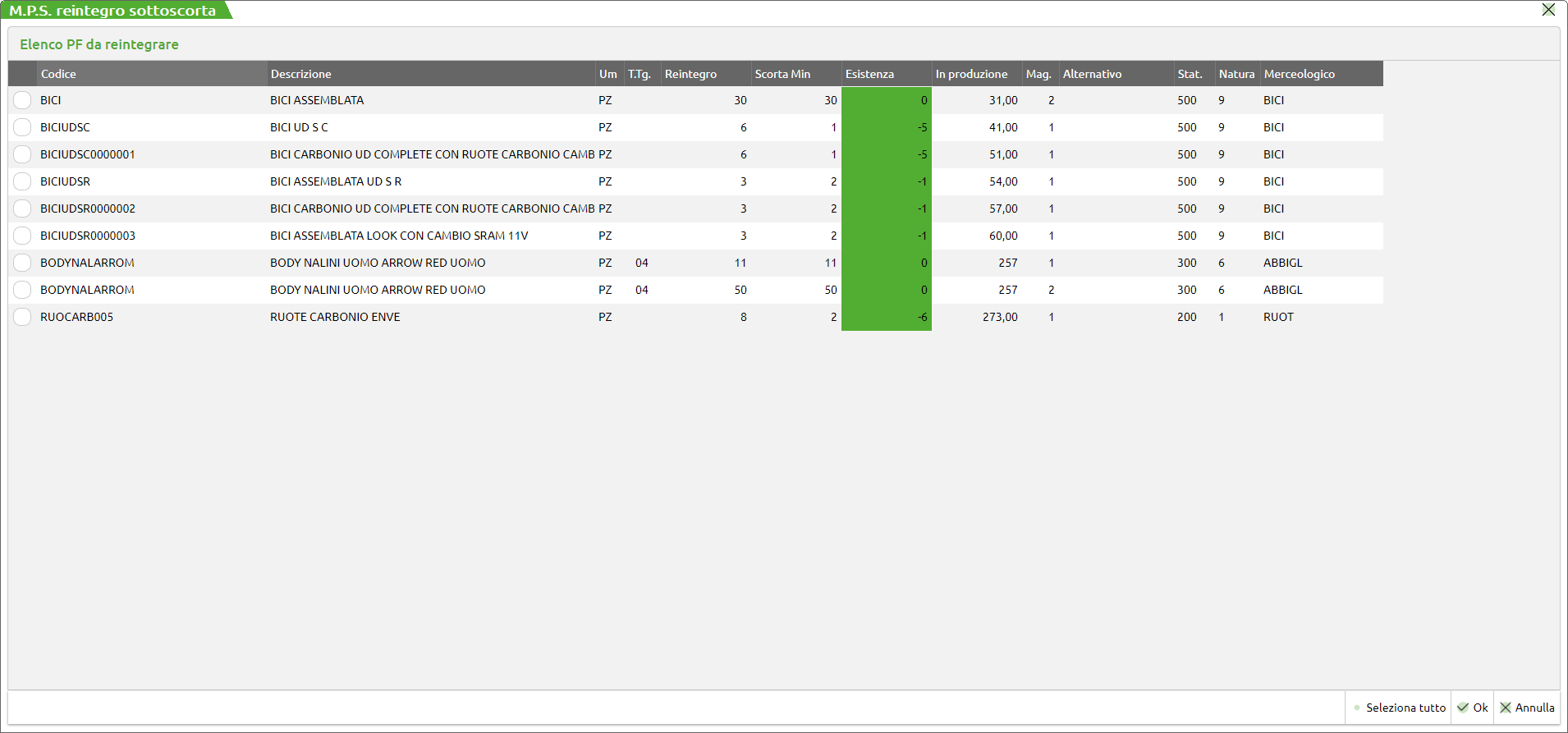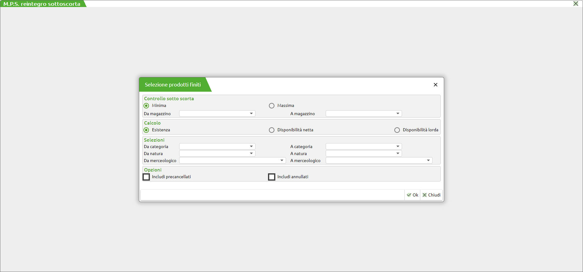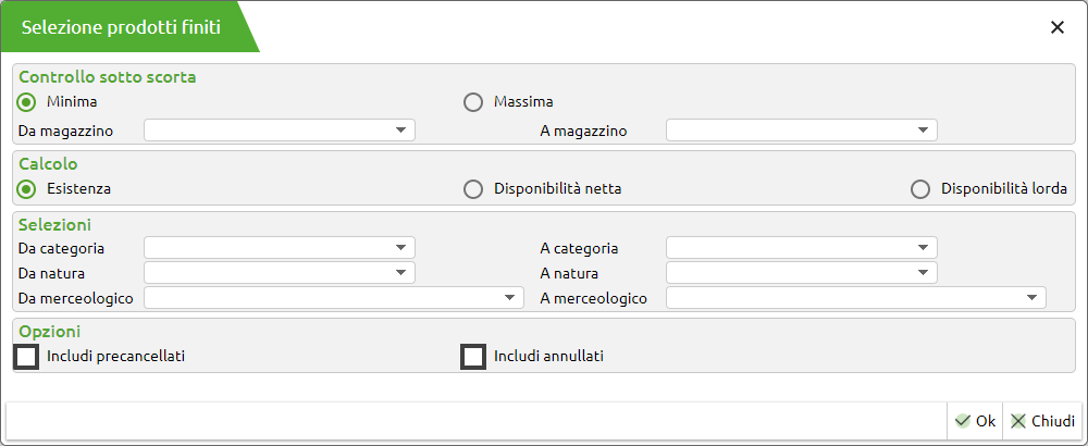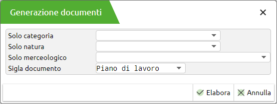 L'app permette la creazione di documenti Piani di lavoro o Bolle di lavoro elaborando tutti i prodotti finiti che hanno la gestione della scorta minima o massima elaborando l'esistenza o la disponibilità netta o la disponibilità lorda