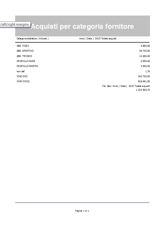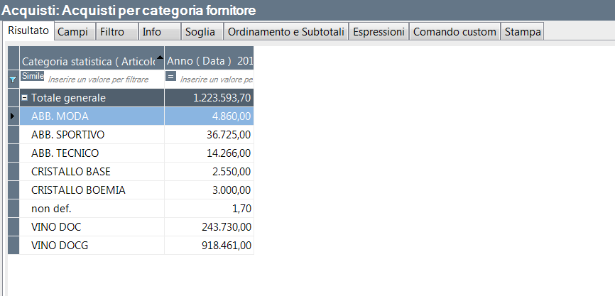 Il report permette di analizzare l’acquistato per categoria fornitore