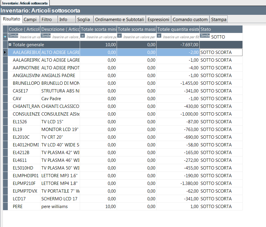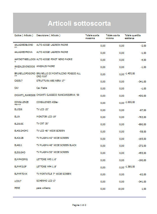 Il report permette di analizzare per ogni articolo la scorta minima, massima e il relativo stato.