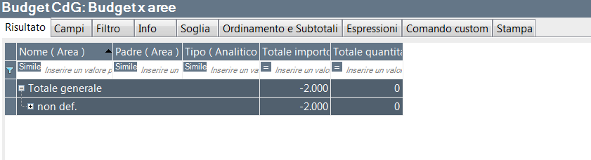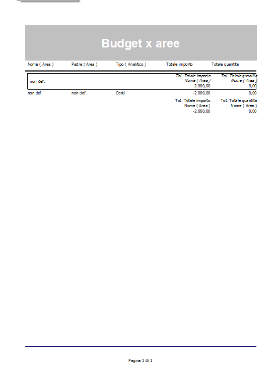 Il report permette di analizzare i budget per aree, con dettaglio del tipo di analitico