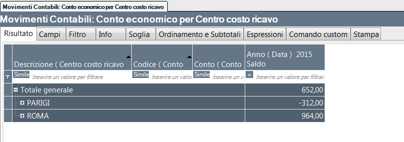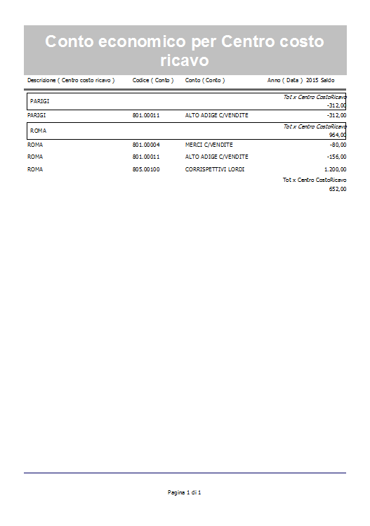 Il report permette di analizzare il saldo dei conti suddivisi per centri di costo e di ricavo per anno