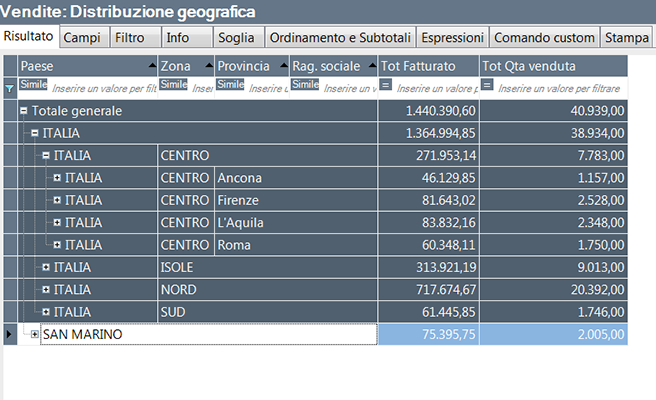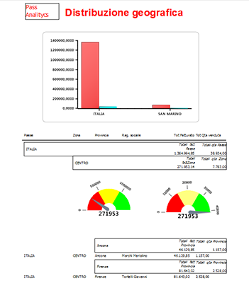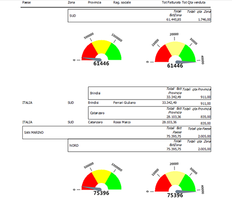 Il report analizza il fatturato e la quantità venduta per paese, zona, provincia con il dettaglio di ciascun cliente. Nella stampa è riportato un grafico dove si analizzano le metriche per paese e in ogni raggruppamento è inserito un indicatore che evidenzia la soglia di vendita per ciascuna zona geografica.