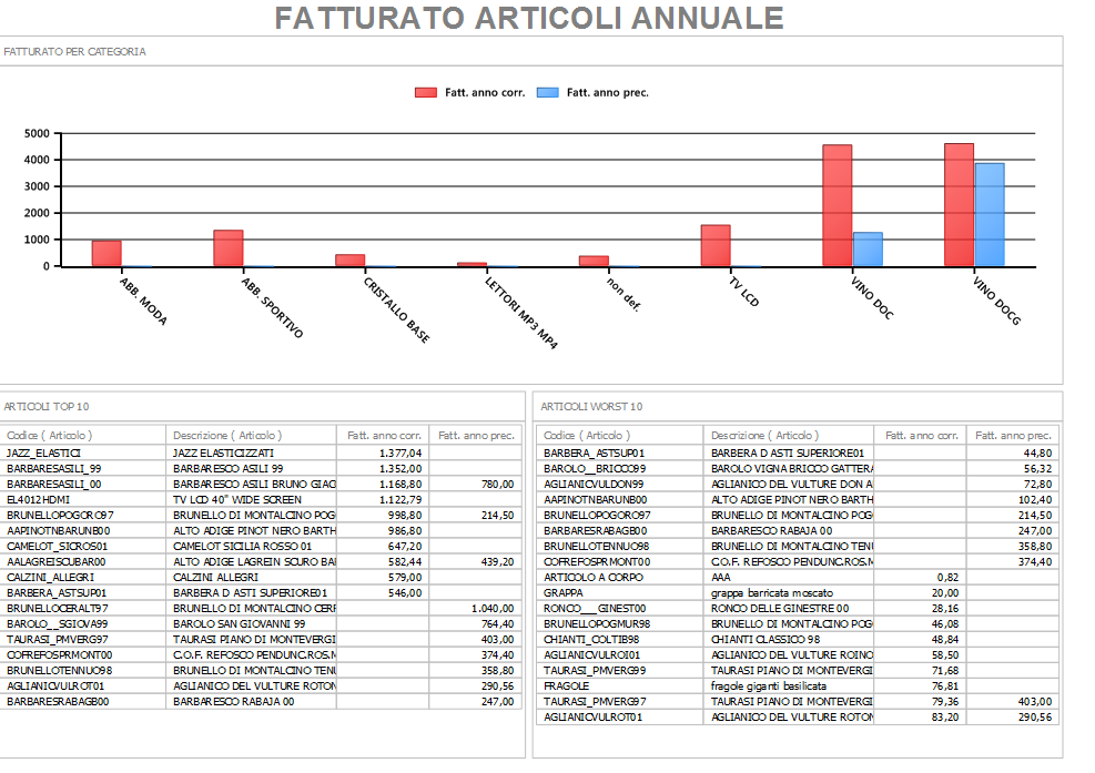 Il cruscotto riporta i dati di fatturato sulle vendite per articolo su un arco temporale da inizio anno ad oggi. Nell' istogramma vengono visualizzate le categorie articolo confrontate sullo stesso periodo dell’anno precedente e dell’anno in corso. Nella parte bassa del cruscotto, sono riportati l’elenco dei migliori 10 articoli e dei peggiori 10 articoli.