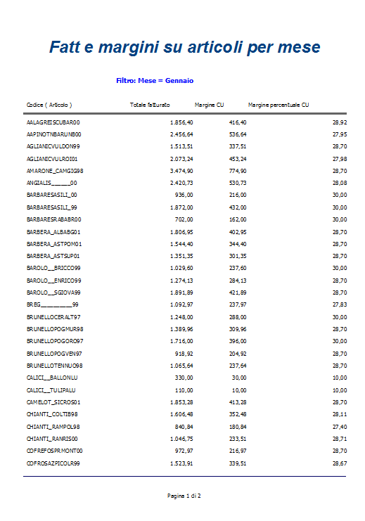 Il report permette di analizzare il fatturato e i margini relativi al costo ultimo e al margine percentuale sugli articoli .
