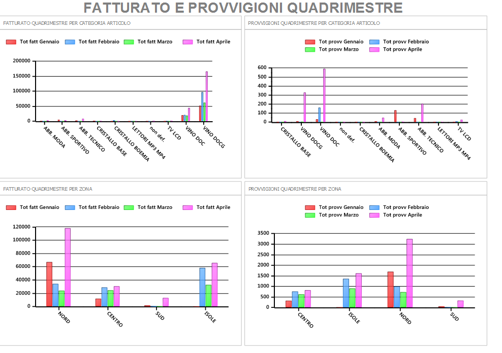 Nel cruscotto viene confrontato il fatturato per categoria articolo, per ogni mese del quadrimestre, con quello del totale provvigioni sempre per categoria articolo sullo stesso periodo. I restanti due grafici ad istogramma confrontano invece il fatturato per quadrimestre per zona con il totale provvigioni per quadrimestre per zona. Il cruscotto contiene un filtro a richiesta sull’ anno, per cui è possibile filtrare su un uno o più anni.