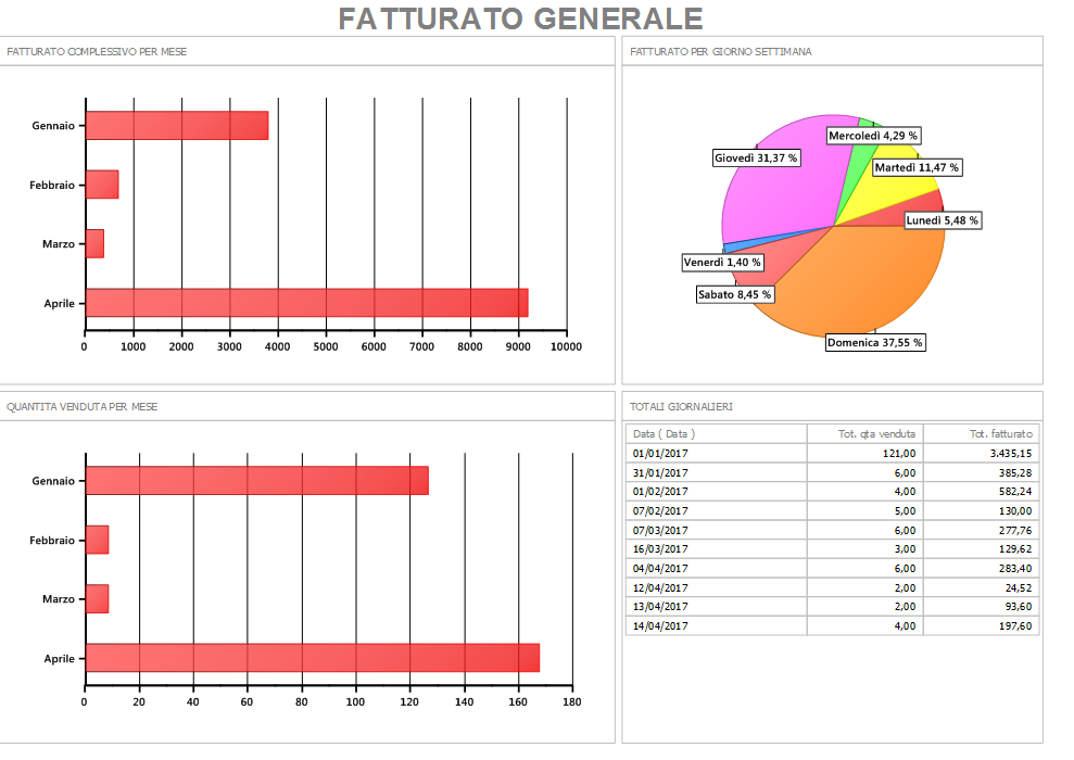 Viene qui rappresentato con un istogramma l’ andamento del fatturato complessivo dell’azienda per mese e in un altro il totale della quantità venduta per mese. Il grafico a torta invece riporta il fatturato dell’azienda suddiviso per giorno della settimana. Nella sezione, in basso a destra, viene visualizzata la tabella con il totale fatturato e la quantità venduta giornalmente.