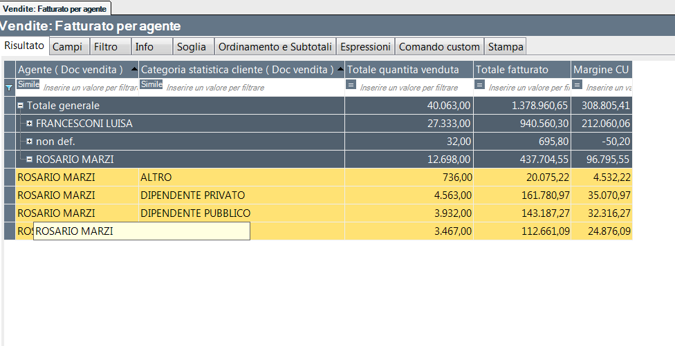 Il report permette di analizzare il fatturato per agente