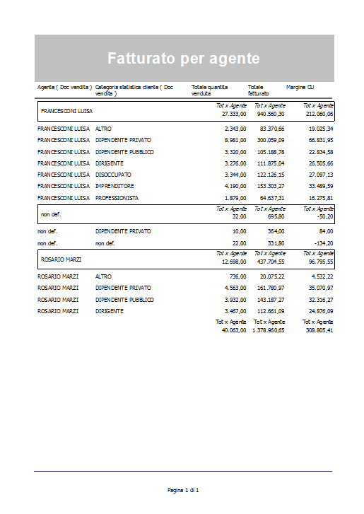 Il report permette di analizzare il fatturato, il margine e la quantità venduta per agente e per categoria statistica cliente