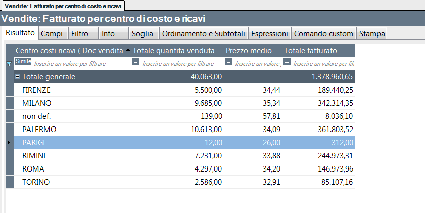 Il report permette di analizzare il fatturato, la quantità venduta e il prezzo medio per centri di costo e ricavi