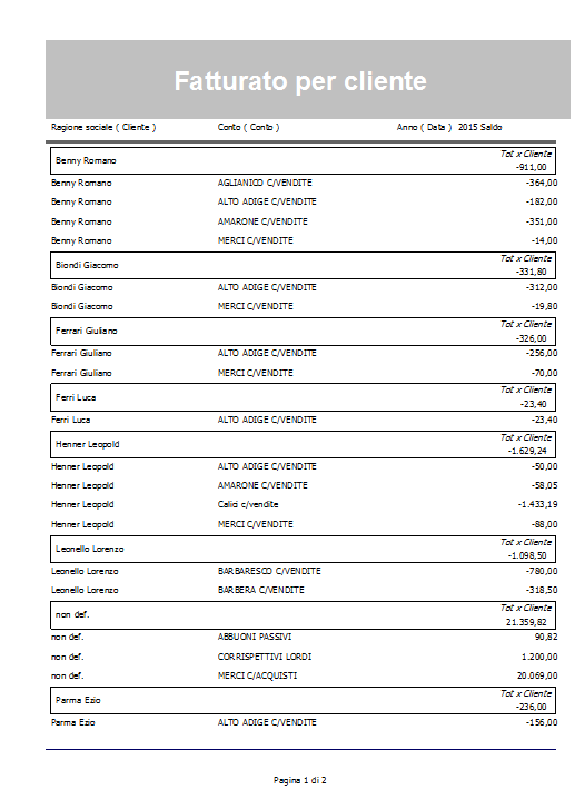 Il report permette di analizzare il saldo per anno per cliente con il dettaglio del conto di ricavo.