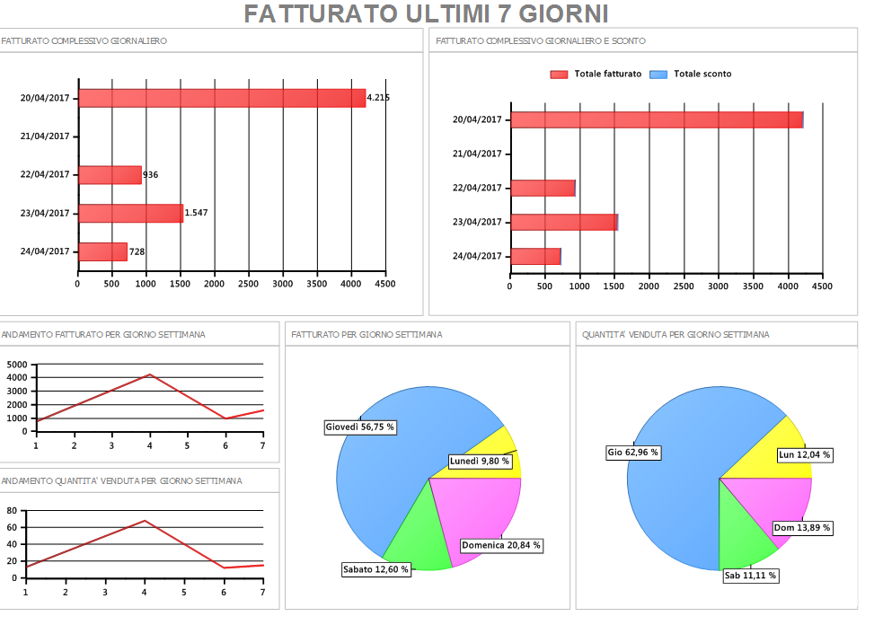 Nel Cruscotto vengono rappresentati gli andamenti del fatturato e della quantità venduta negli ultimi sette giorni. Nei due istogrammi proposti vengono totalizzati, per data, il fatturato al lordo degli sconti mentre nel grafico a lato, rispettivamente, il valore del totale fatturato e quello dello sconto.