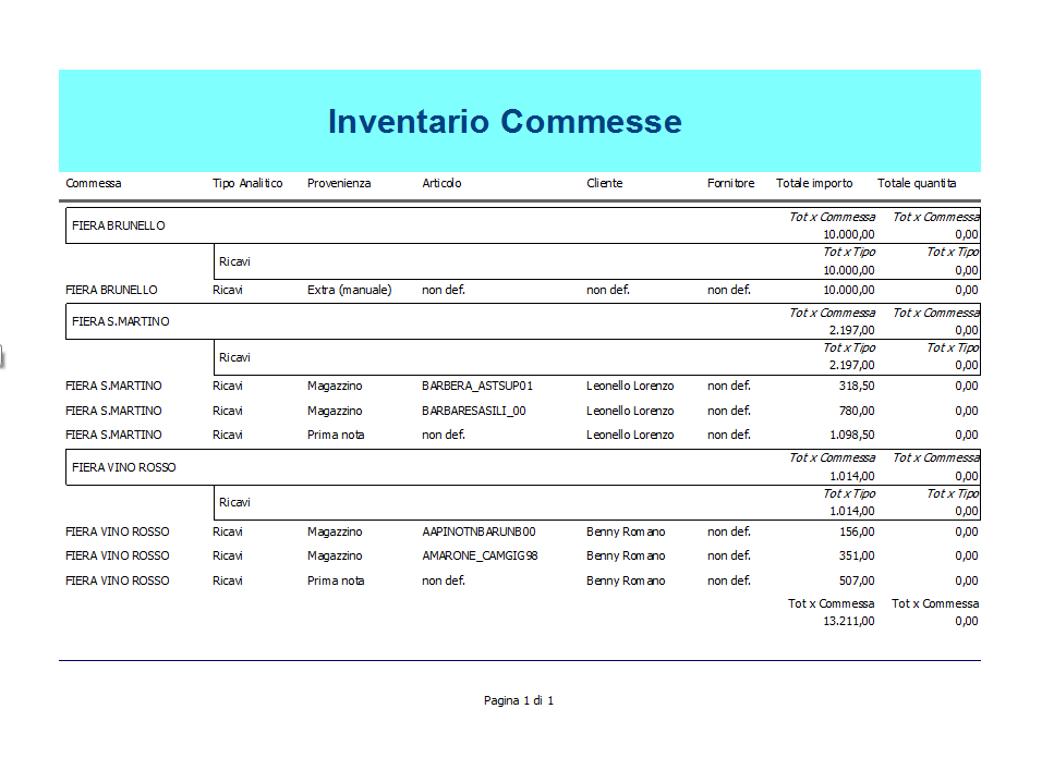 Il report permette di analizzare l’inventario delle commesse con dettaglio del tipo di analitico, della provenienza, dell’articolo, del cliente e del fornitore