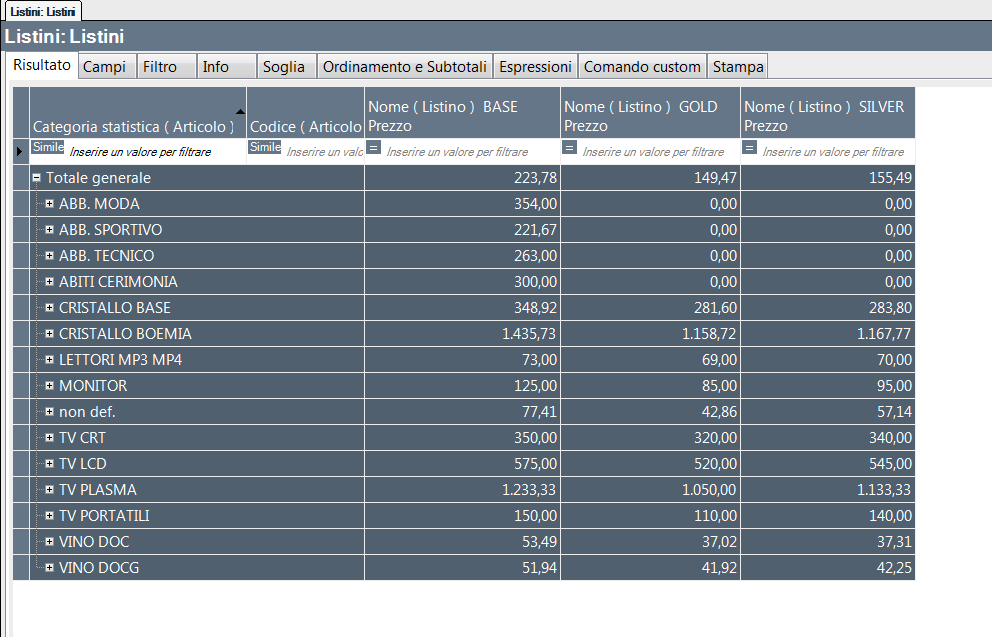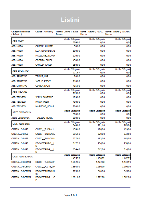 Il report permette di analizzare le categorie statistiche articolo e gli articoli con i relativi prezzi di listino.