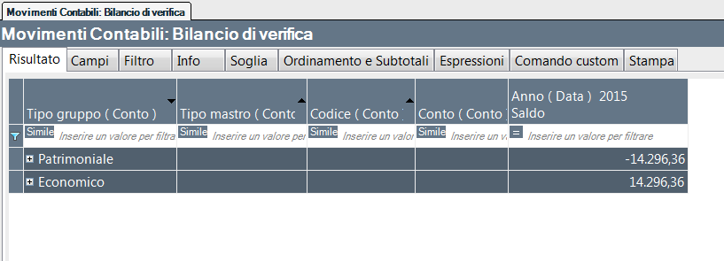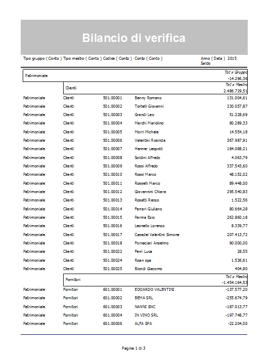 Il report permette di analizzare il saldo dei conti divisi per gruppo e mastro per anno.