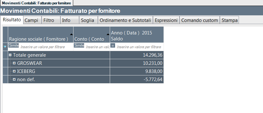 Il report permette di analizzare il saldo dei fornitori per anno con il dettaglio dei conti economici relativi.