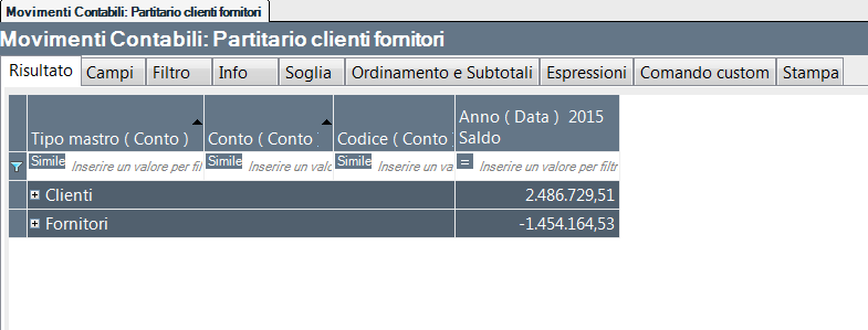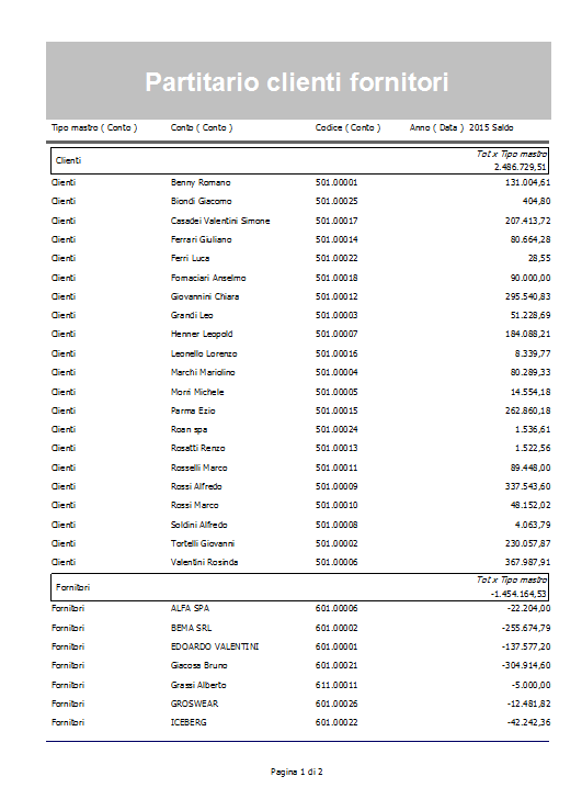 Il report permette di analizzare il partitario clienti e fornitori per anno con il dettaglio del codice.