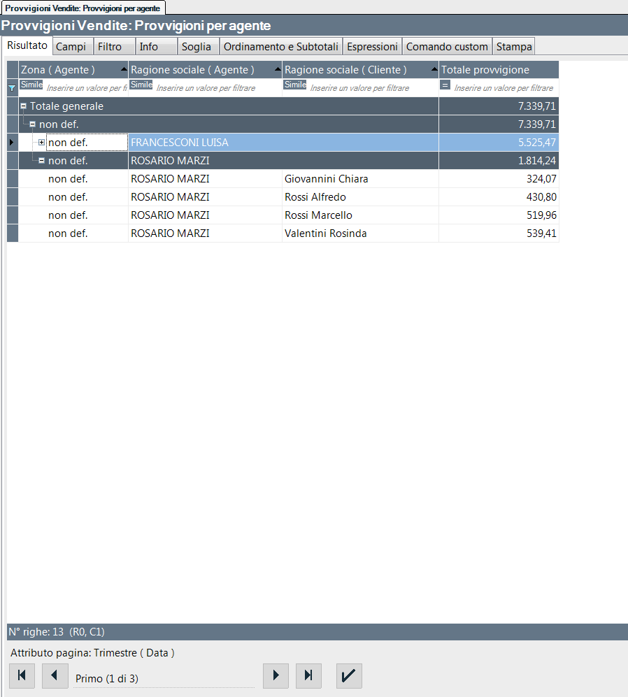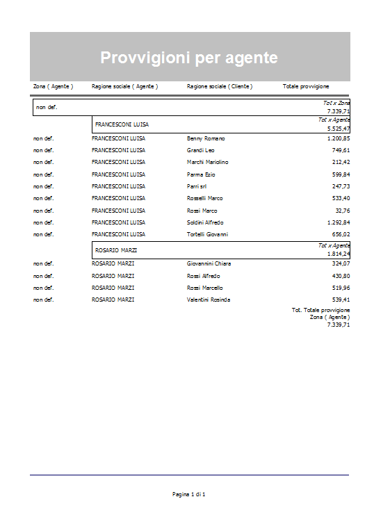 Il report permette di analizzare il totale provvigioni suddiviso per agente e per relativo cliente.