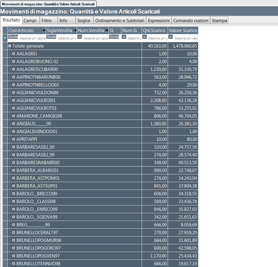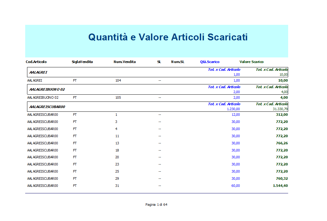 Il report permette di analizzare la quantità e il valore di scarico degli articoli con il dettaglio della sigla e del numero documento.