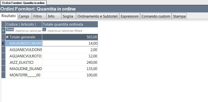 Il report permette di analizzare la quantità in ordine al fornitore
