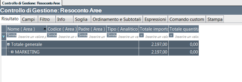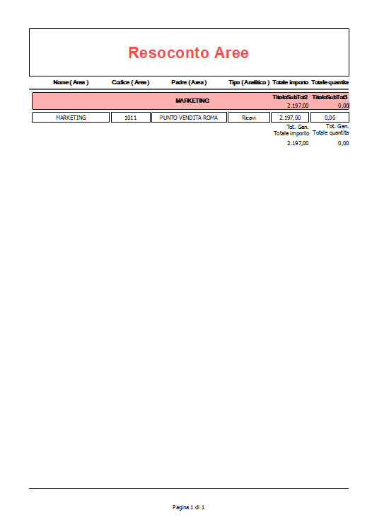 importi e quantità movimentati per ogni Area, con il dettaglio del codice, del padre dell’area e della tipologia dell’analitico