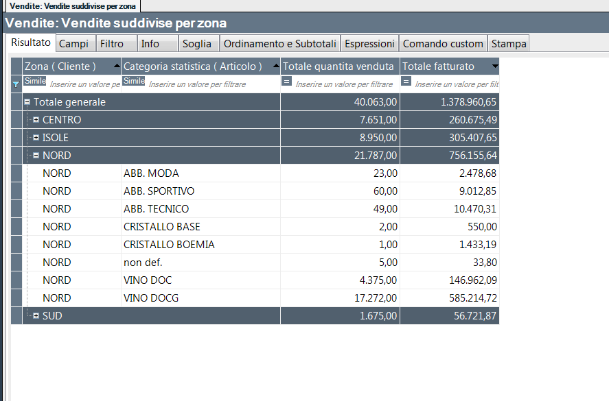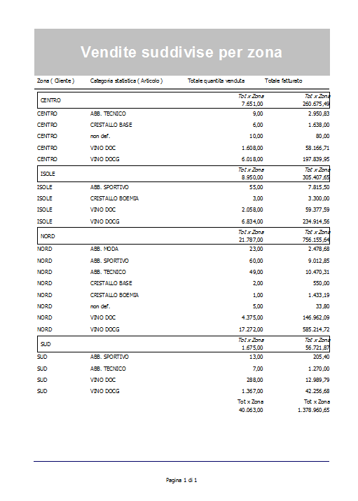 Il report permette di analizzare il fatturato e quantità venduta per zona cliente e per categoria statistica articolo.