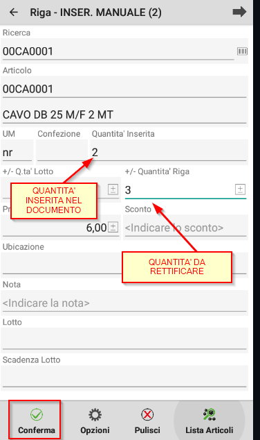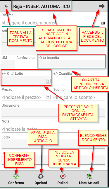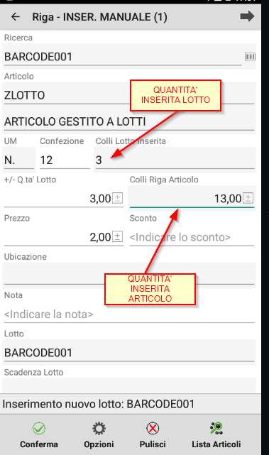 matricola/lotto, alias, codice alternativo, codice articolo. descrizione